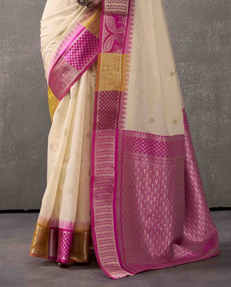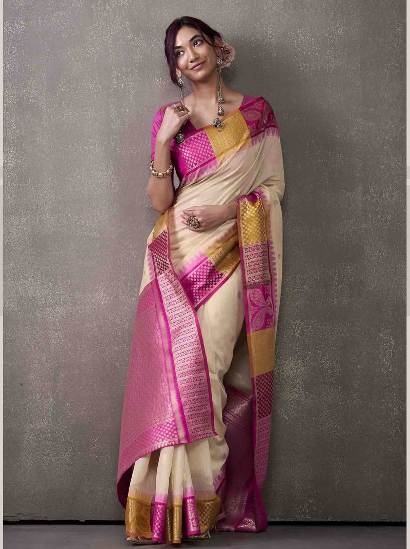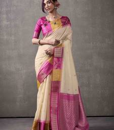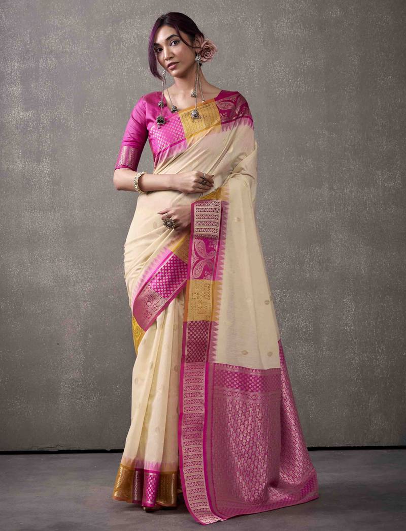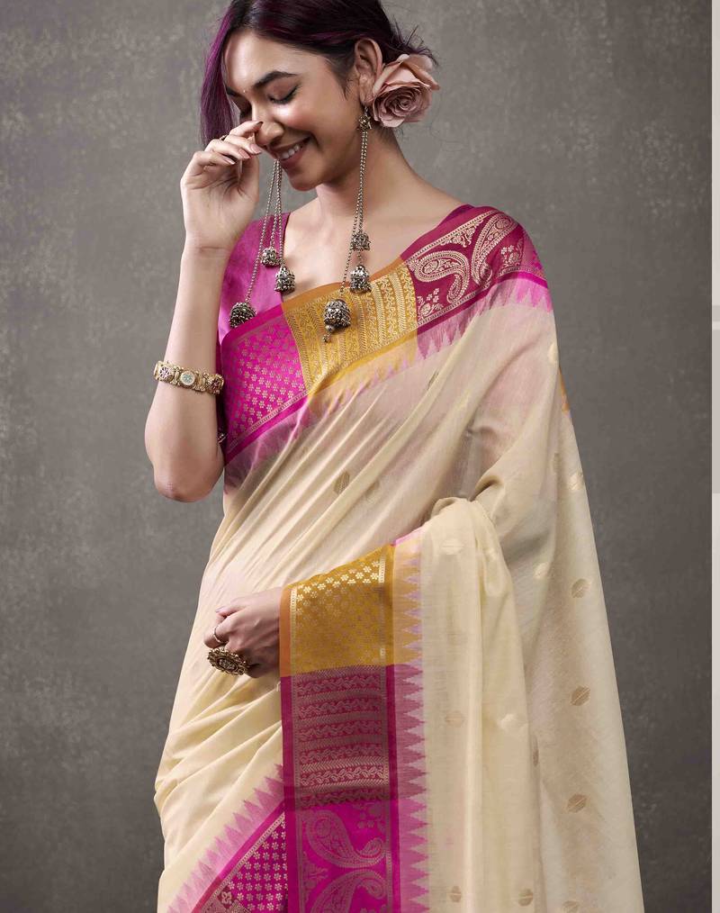 Women's cream modal cotton zari woven saree with unstitched silk blouse piece