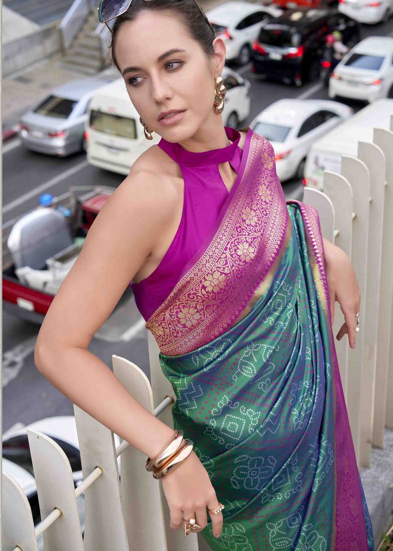 Women's dark green soft silk bandhani saree with unstitched silk blouse piece