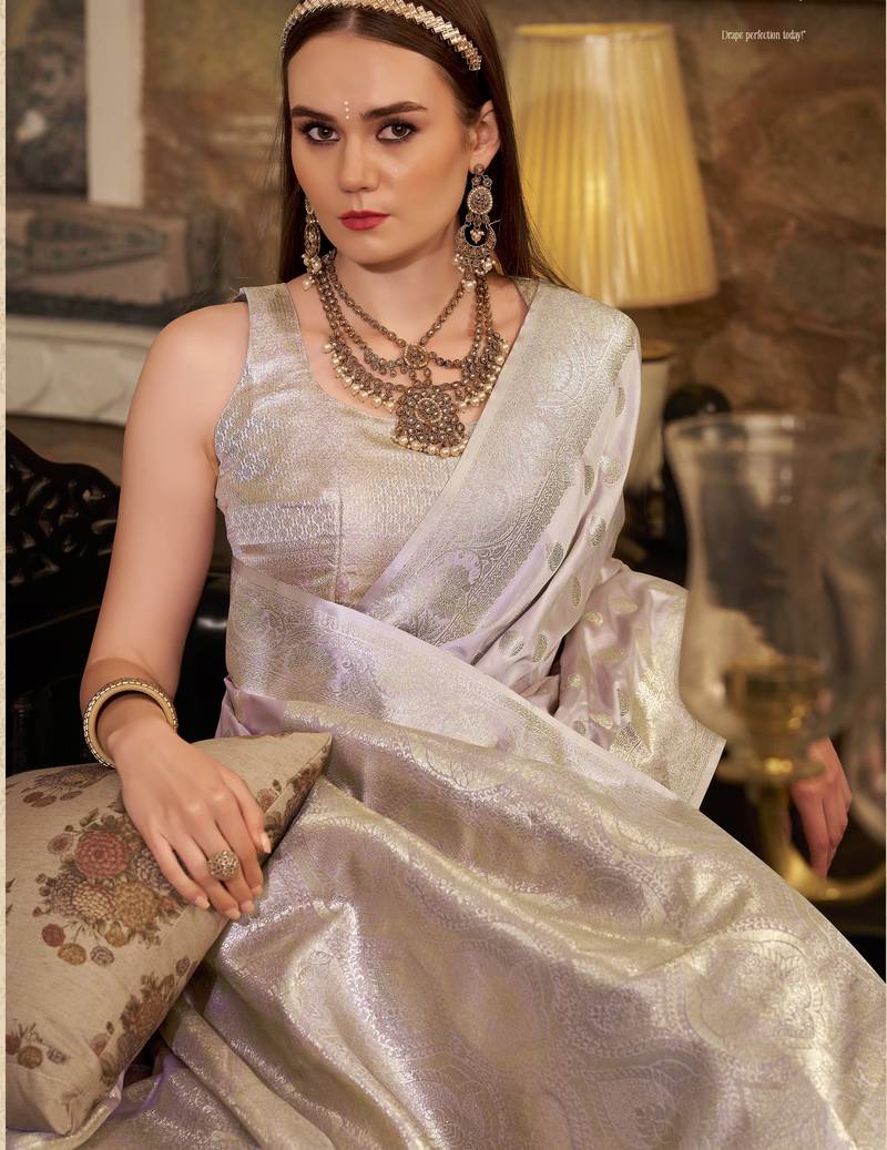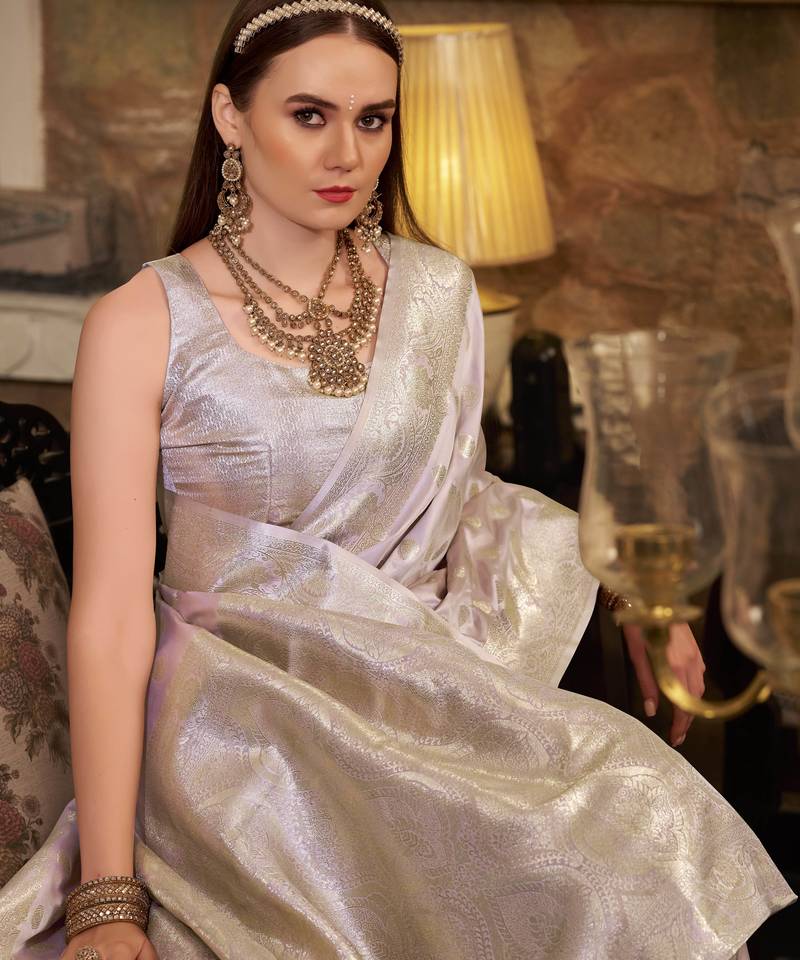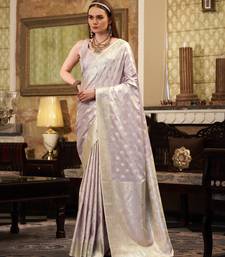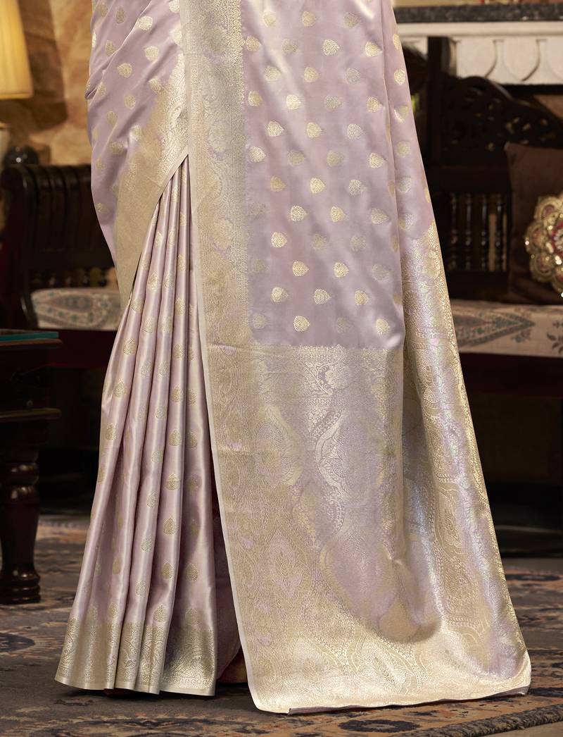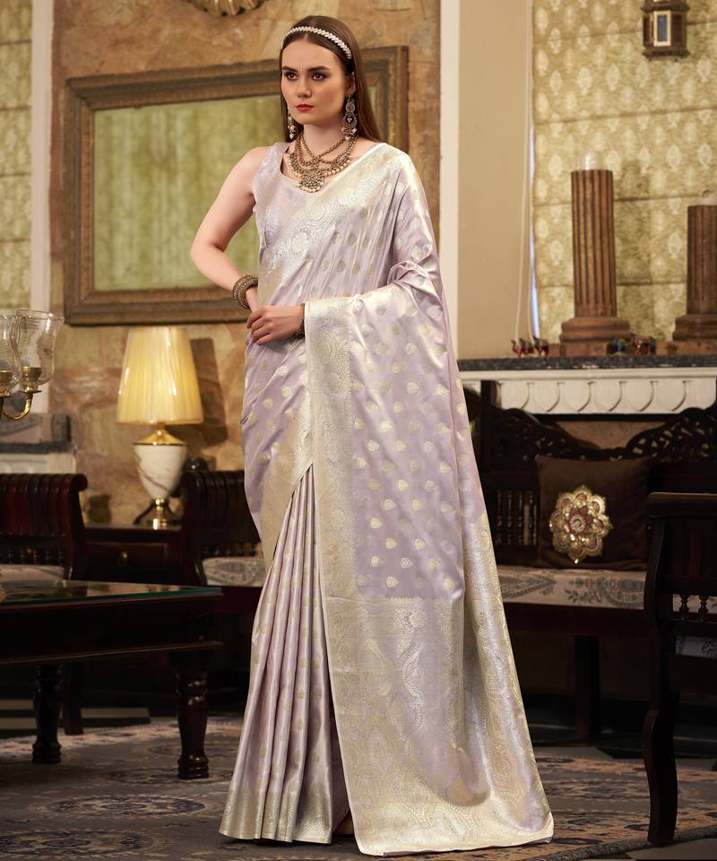 Women's lavender satin banarasi silk saree with unstitched silk blouse piece