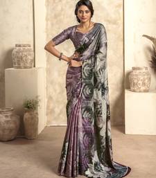 Women's lavender satin crepe printed saree with unstitched silk blouse piece