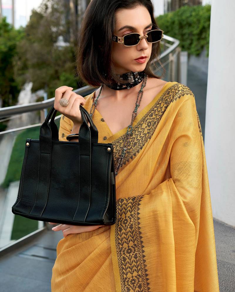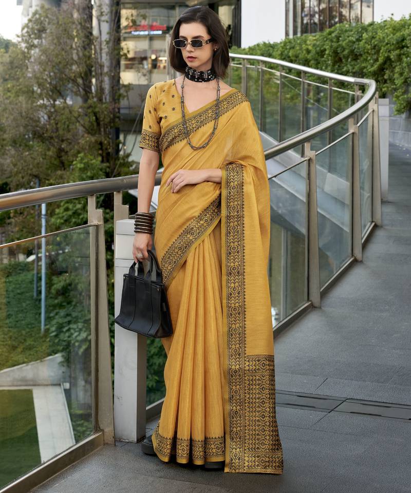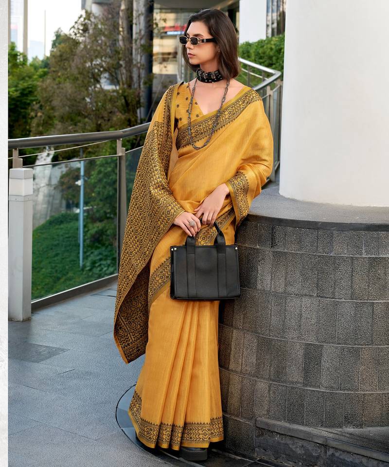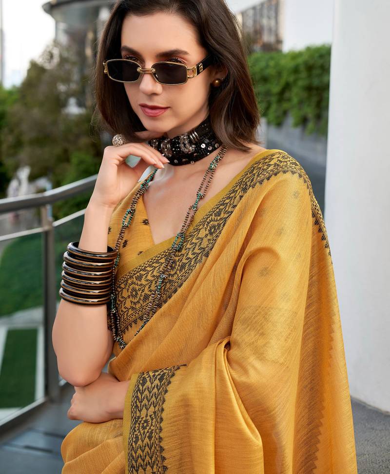 Women's mustard silk blend woven saree with unstitched silk blouse piece