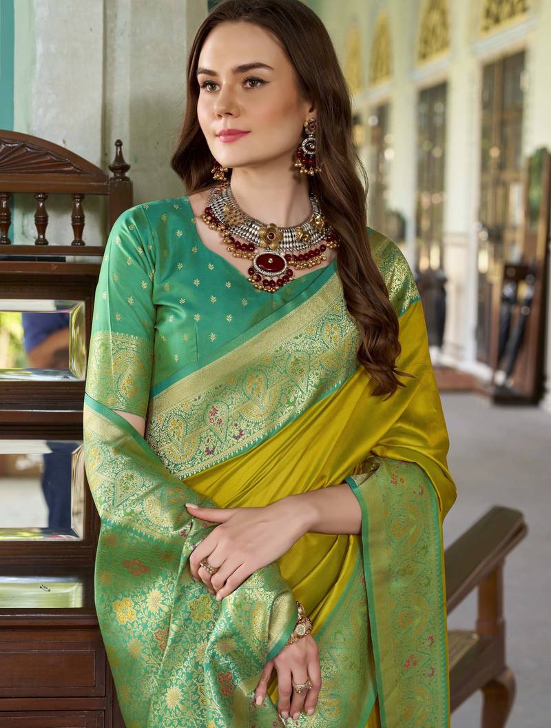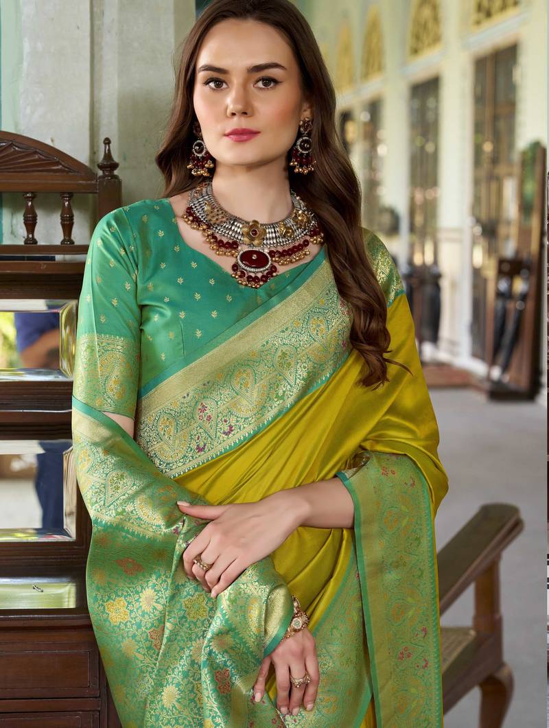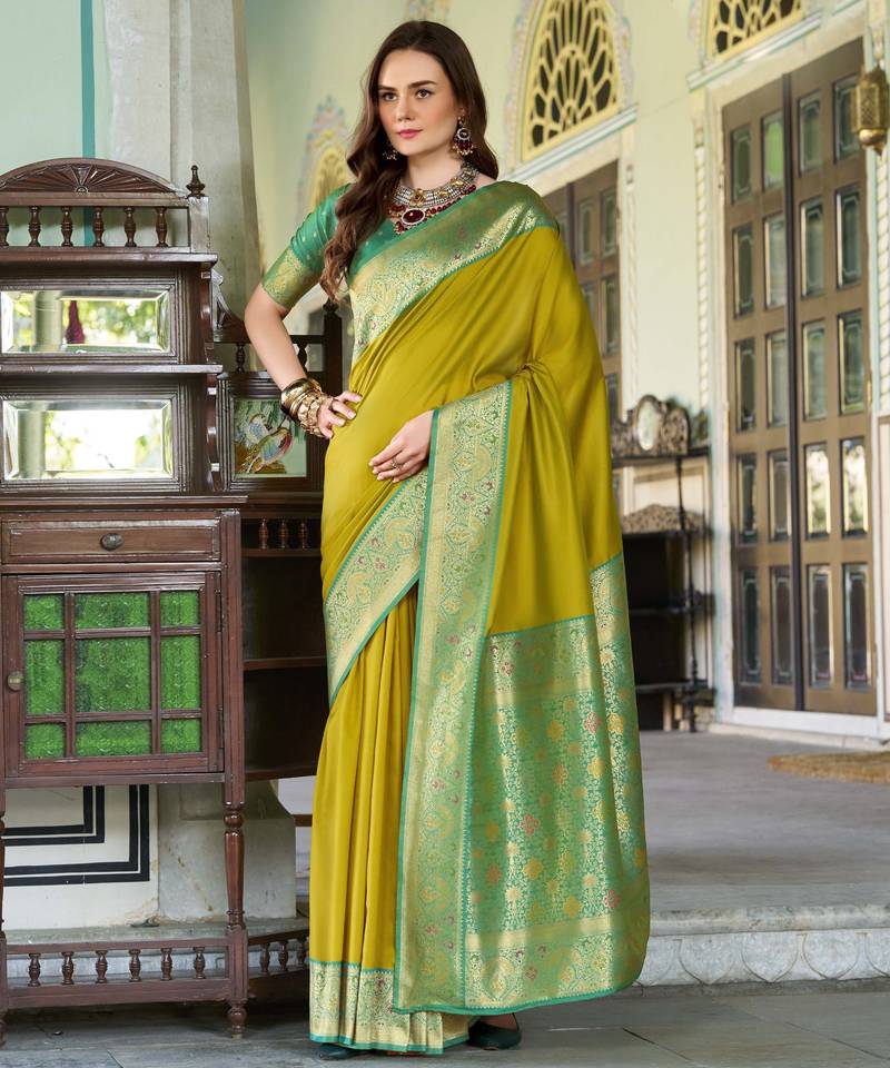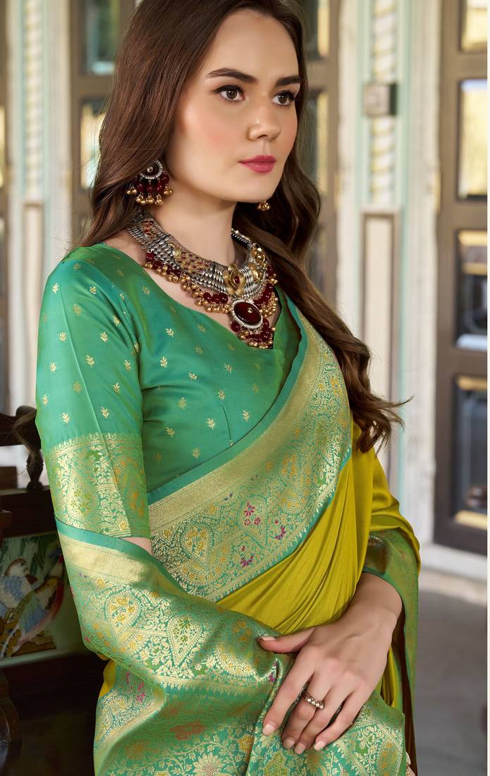 • | Saree | : | Color- Lime / Fabric- Silk Blend |