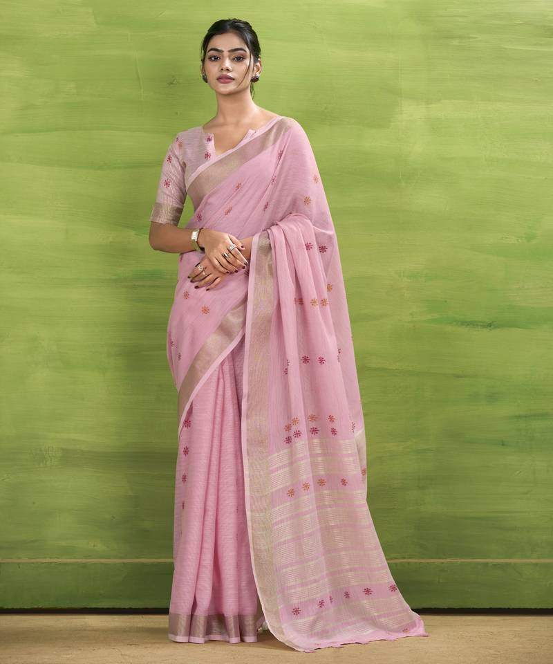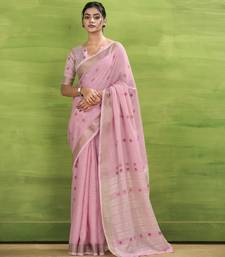 Women's pink linen silk bandhani woven saree with unstitched silk blouse piece