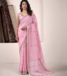 Women's pink linen silk woven saree with unstitched silk blouse piece
