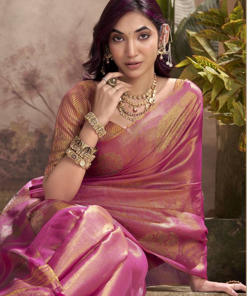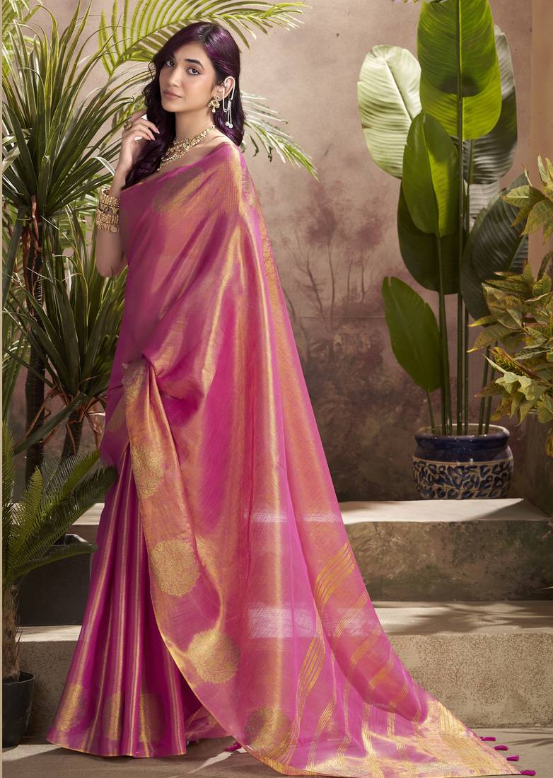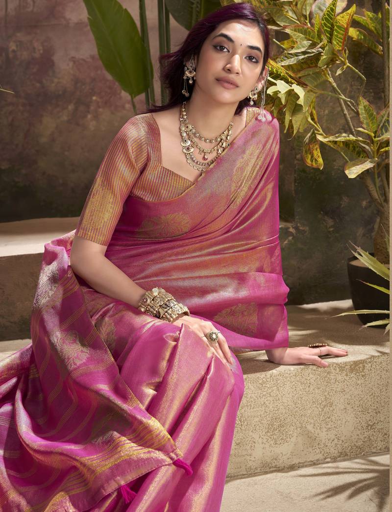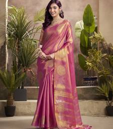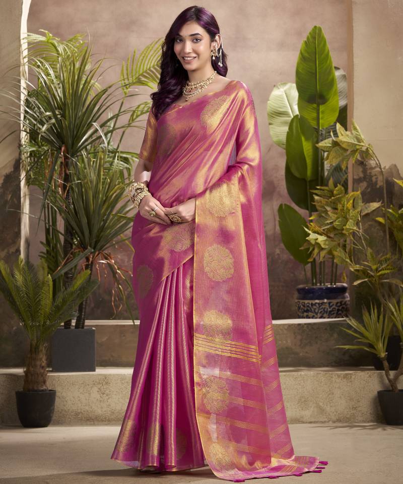 Women's pink tissue silk zari woven saree with unstitched silk blouse piece