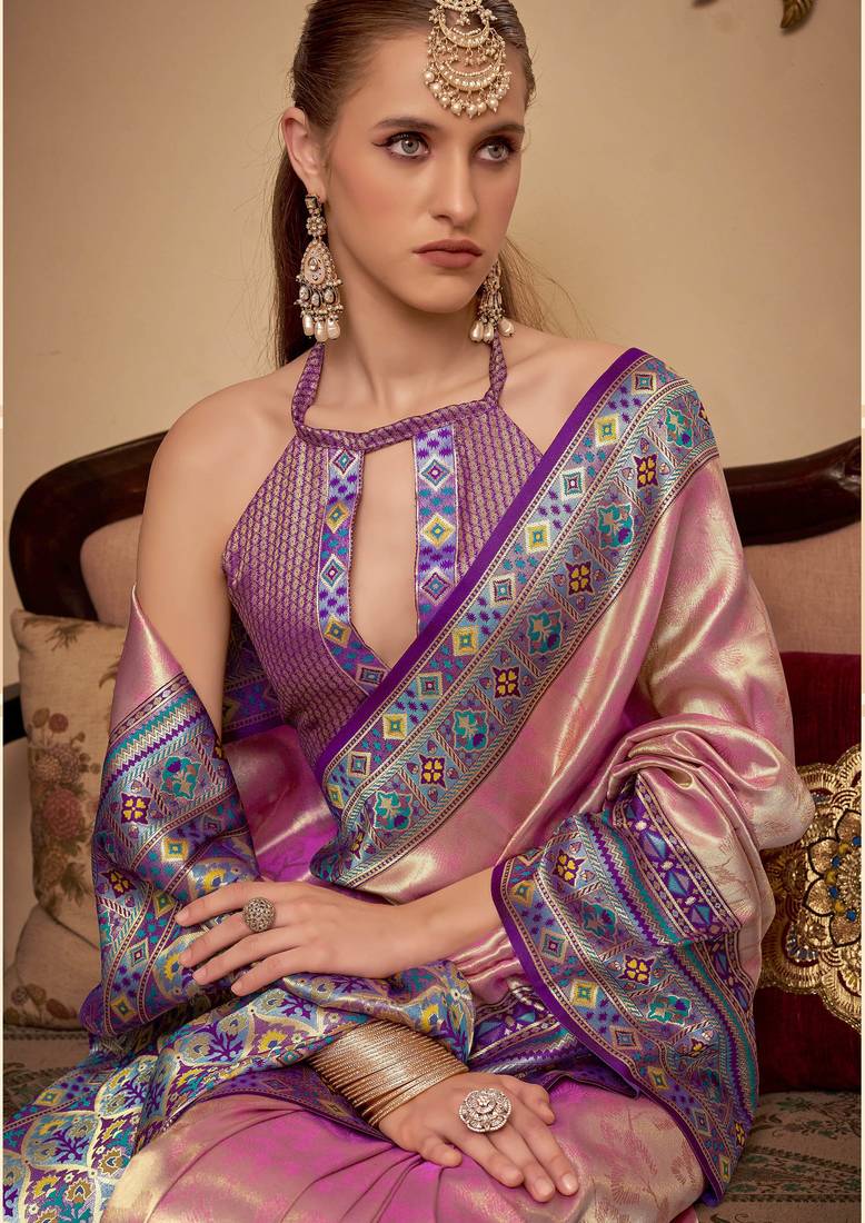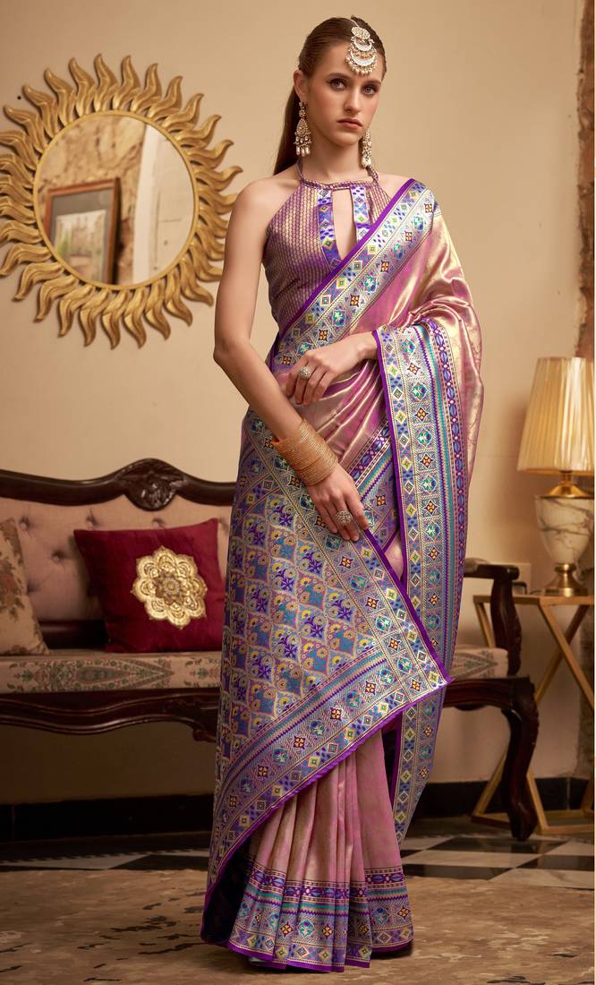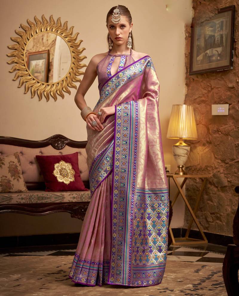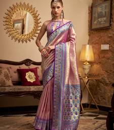 Women's pink tissue silk zari woven saree with unstitched silk blouse piece