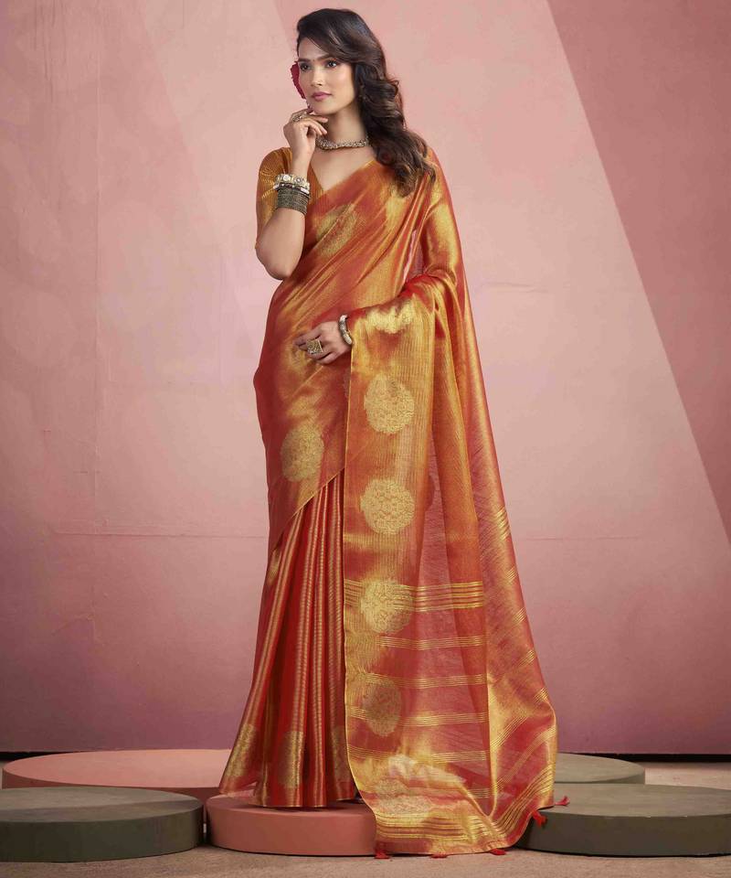 Women's rust tissue silk zari woven saree with unstitched silk blouse piece