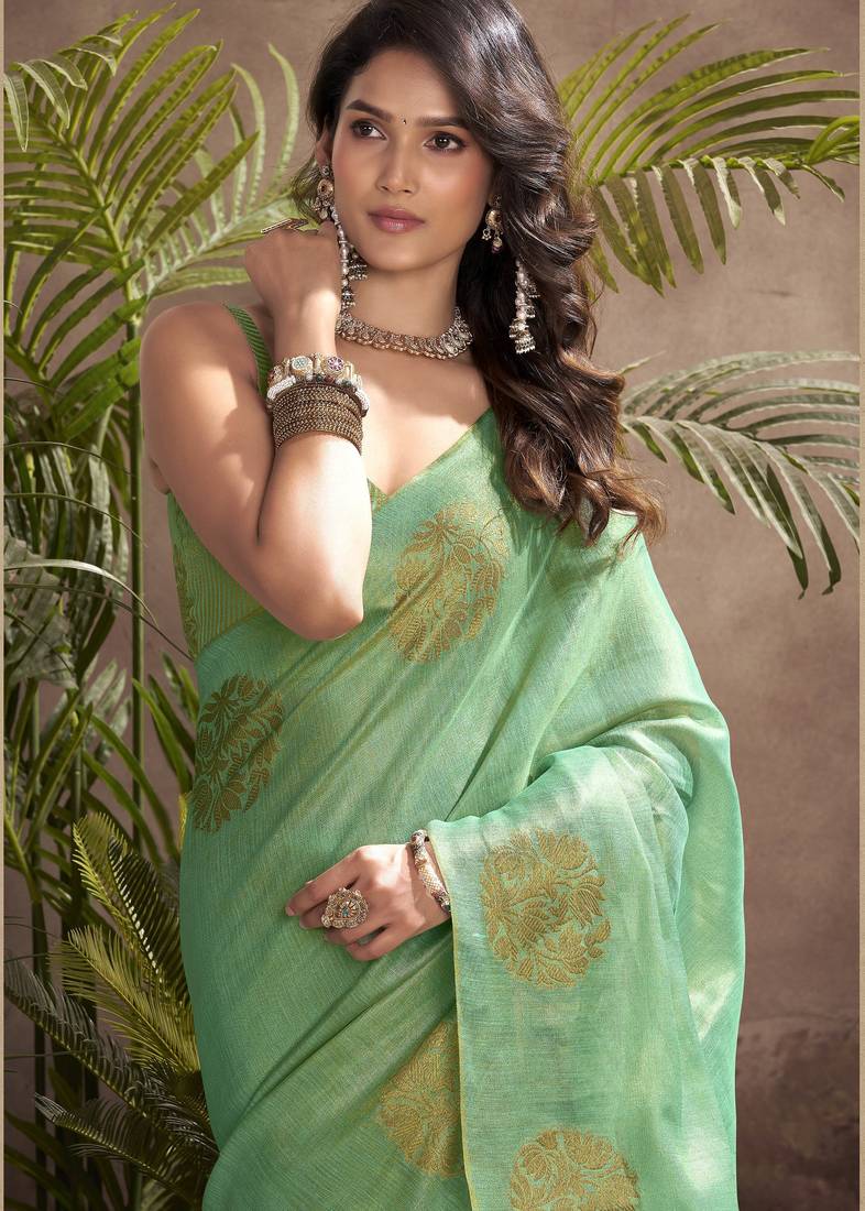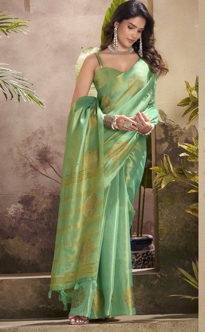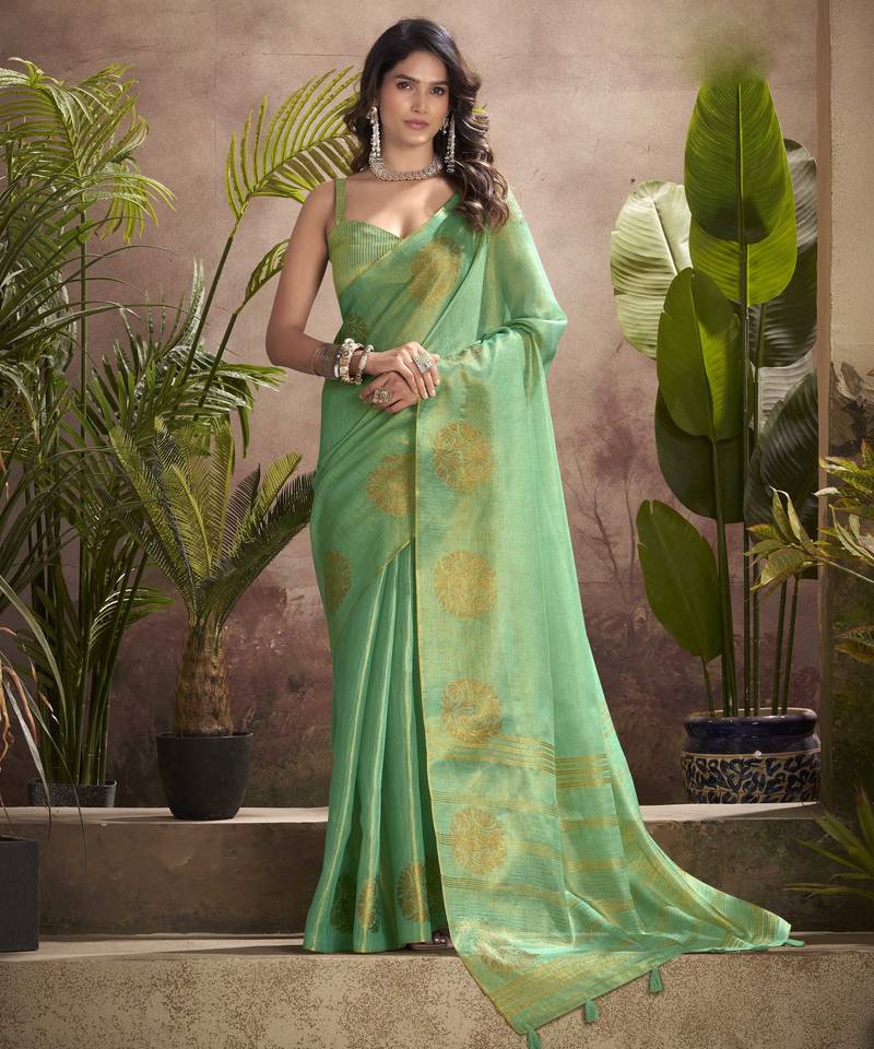 Women's sea green tissue silk zari woven saree with unstitched silk blouse piece