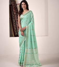 Women's turquoise linen silk woven saree with unstitched silk blouse piece