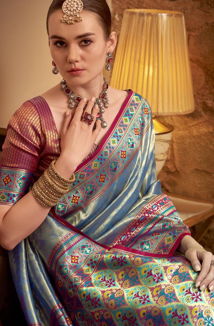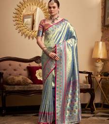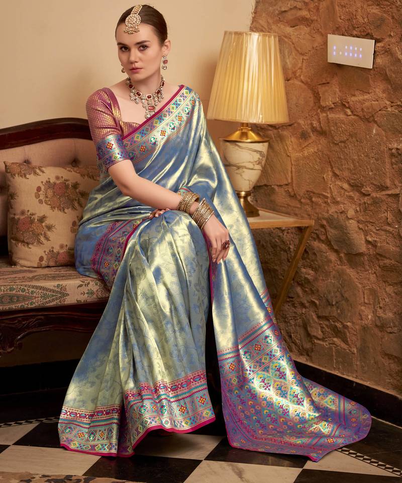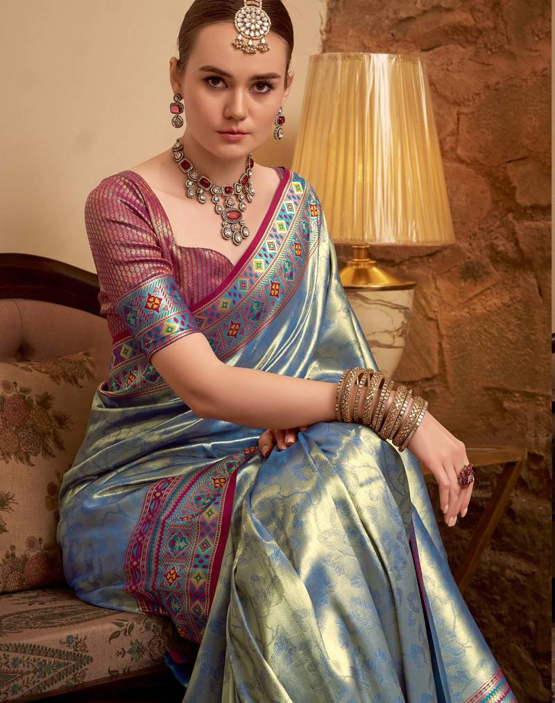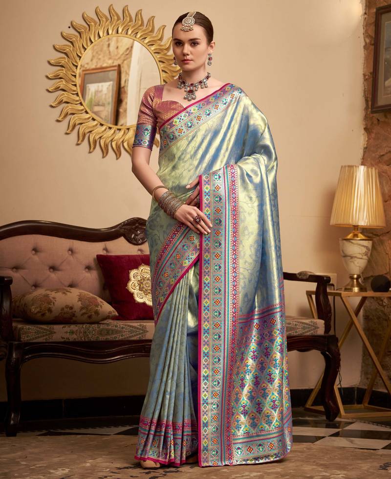Women's turquoise tissue silk zari woven saree with unstitched silk blouse piece