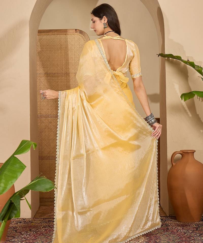 Women's yellow silk blend chiffon swaroski work saree with unstitched blouse piece