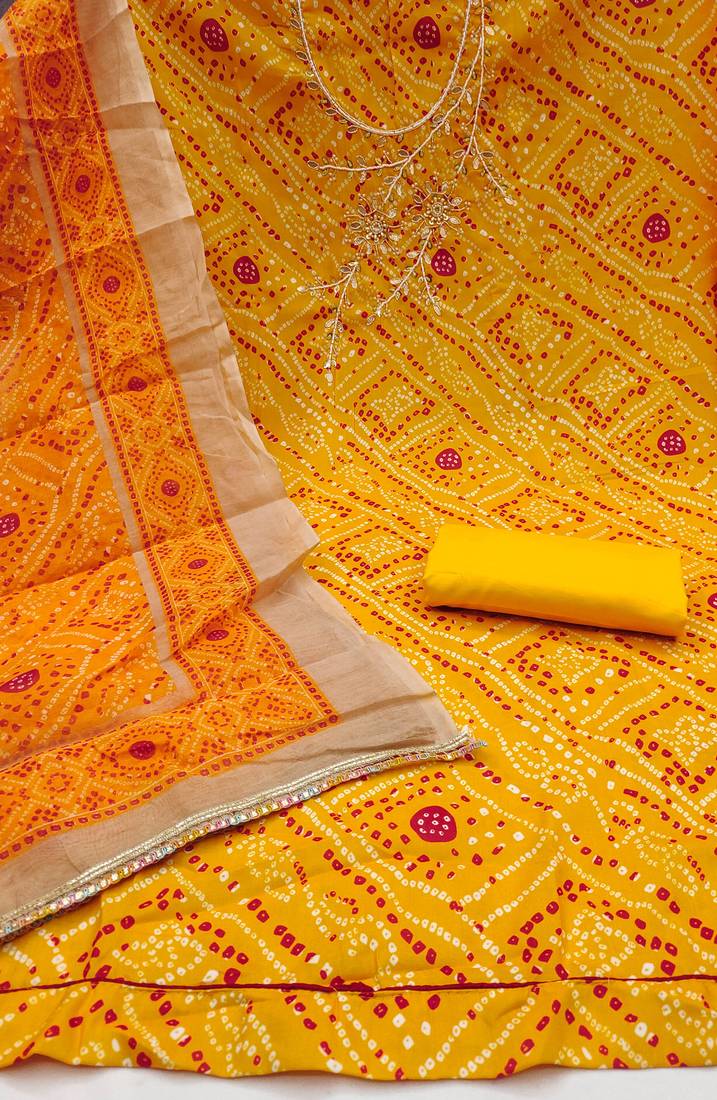 | Product Name | Yellow Modal Cotton Bandhni Unstitched Dress Material | |