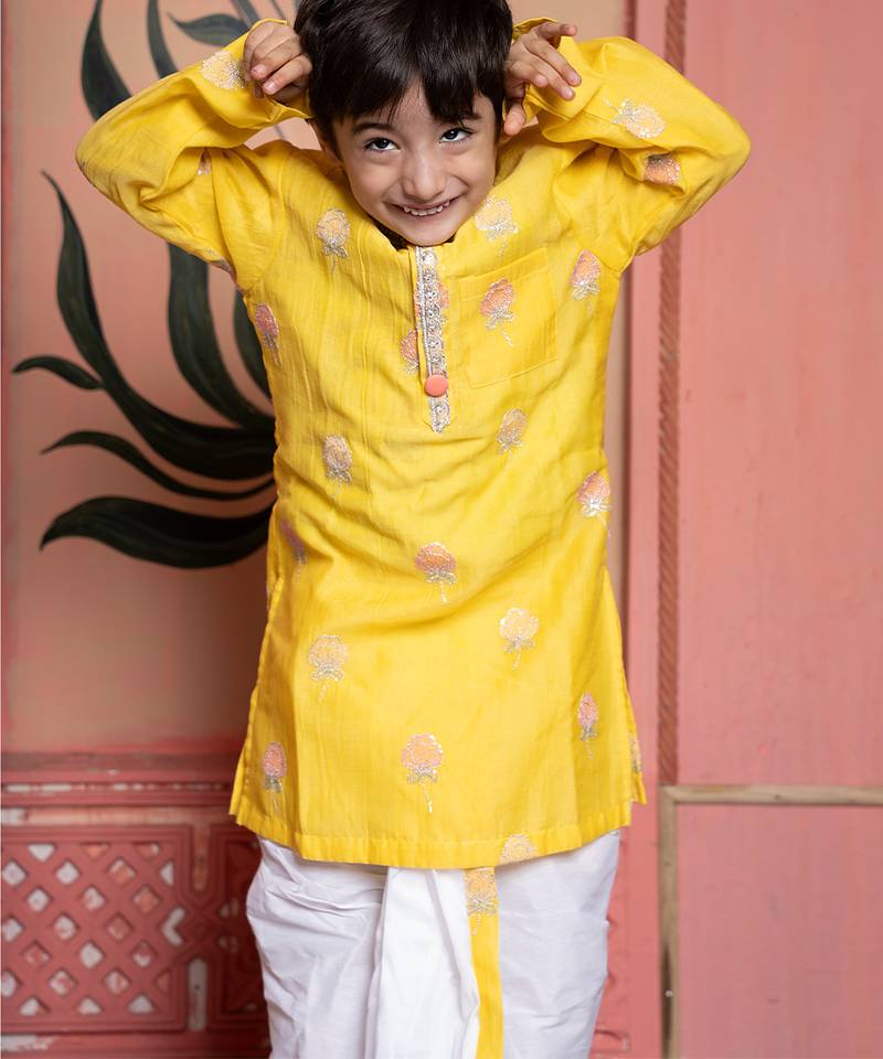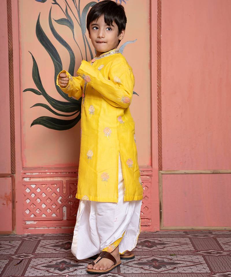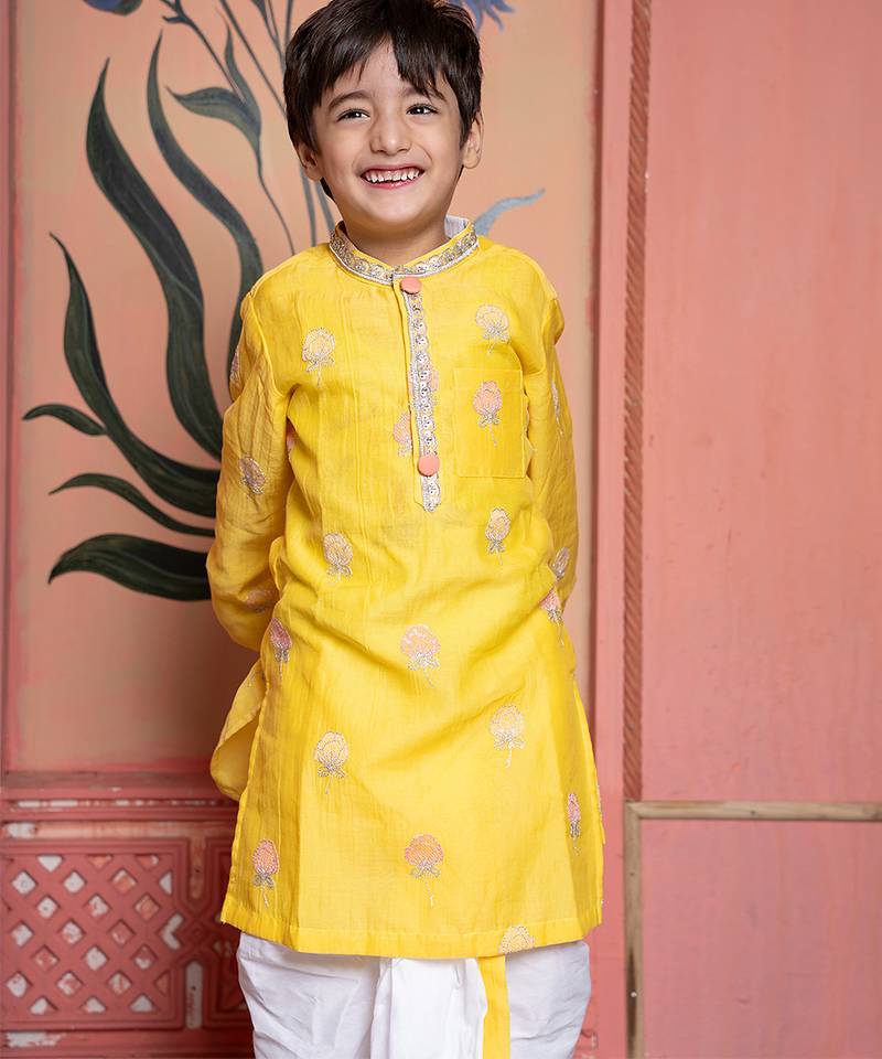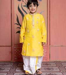 Yellow embroidered chanderi kurta pyjama