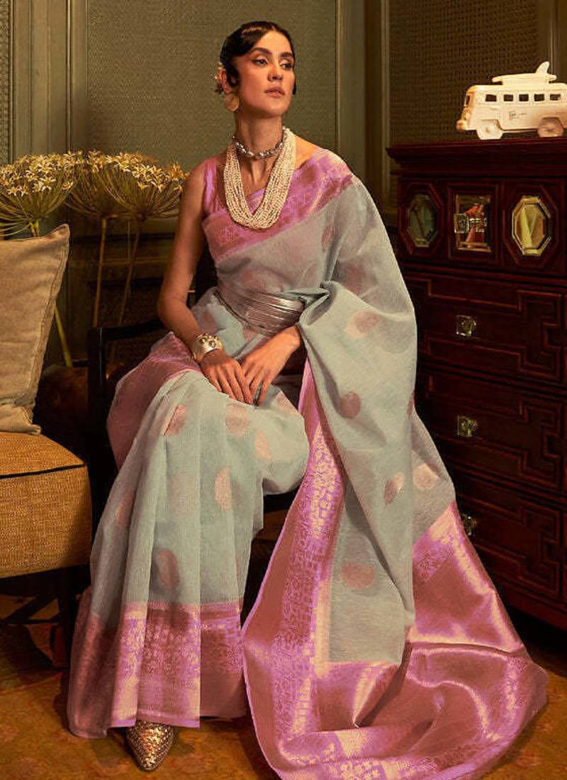 Pastel blue copper zari woven linen silk saree with blouse for women