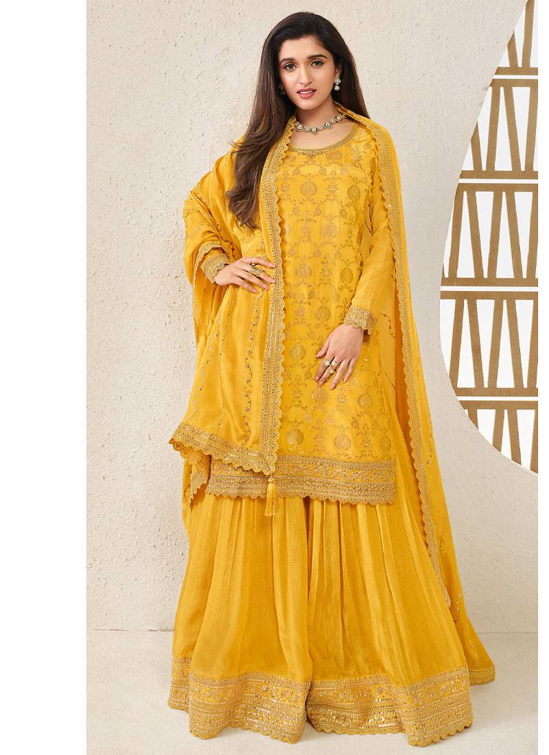 Designer jacquard yellow palazzo suit for women ethnic wear semi stitched