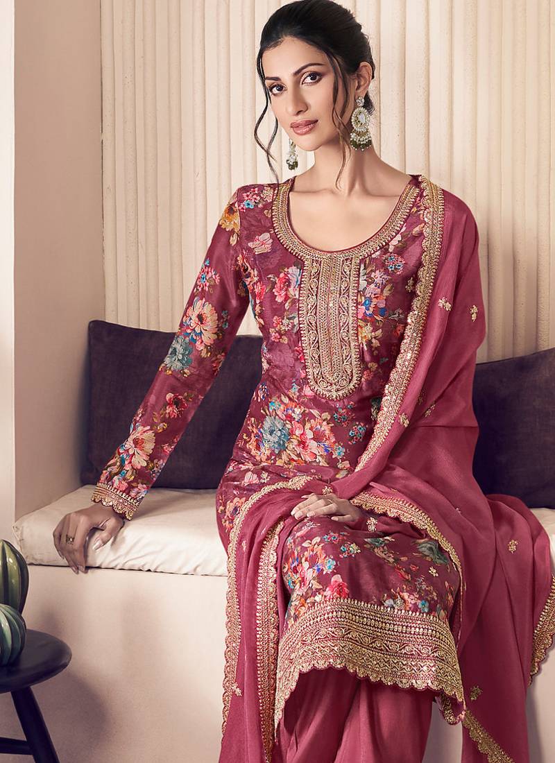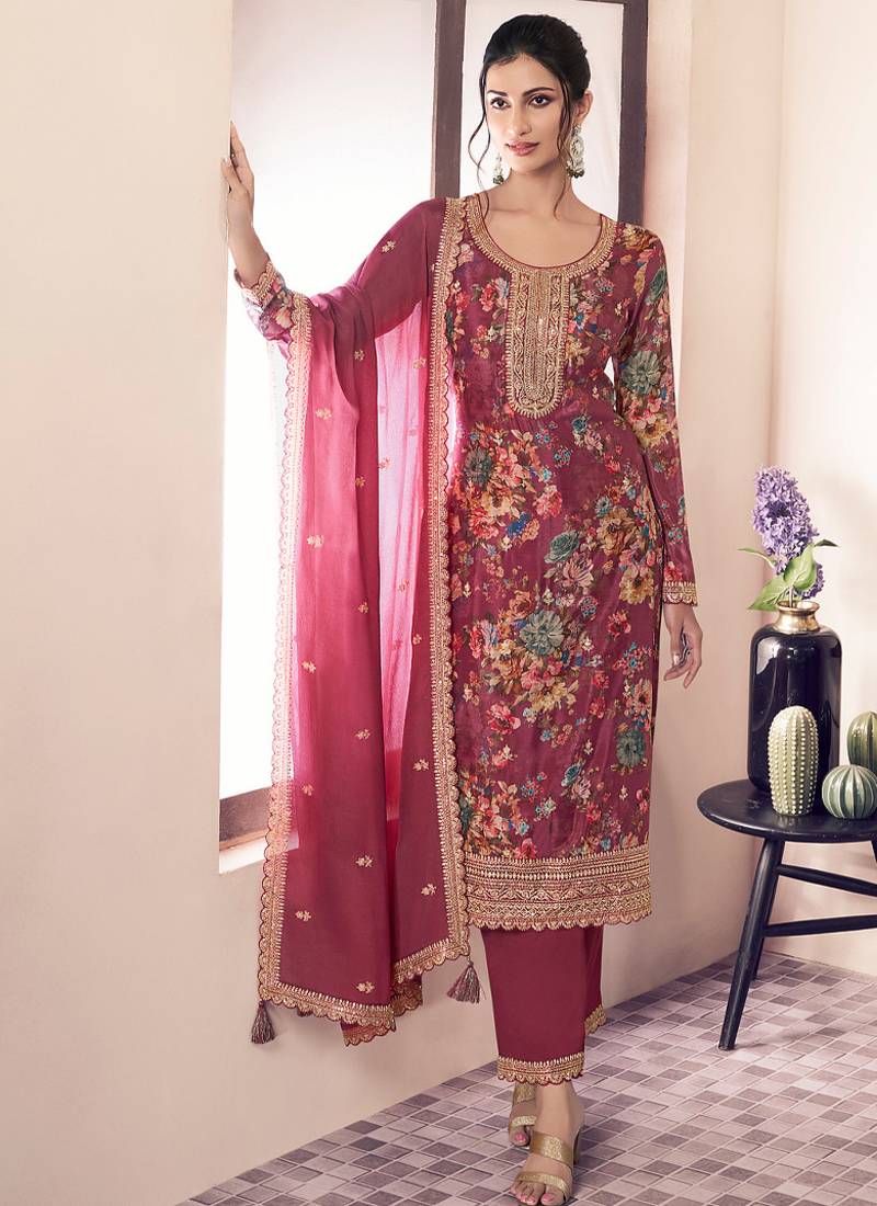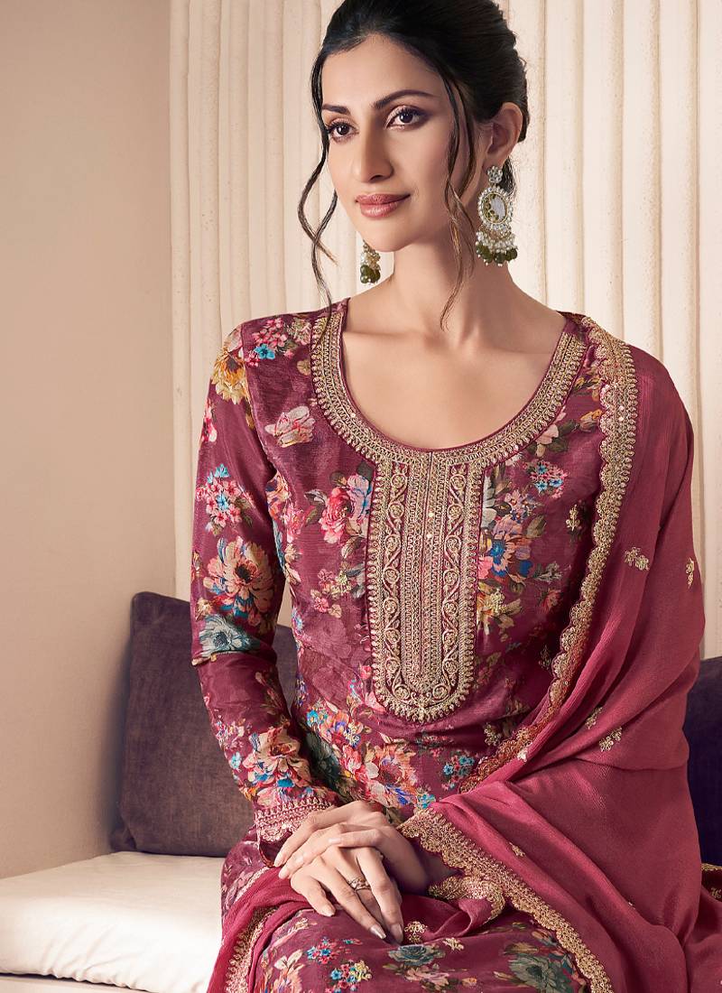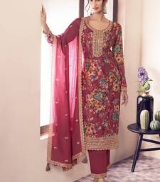 floral printed magenta long suit for women chinon fabric