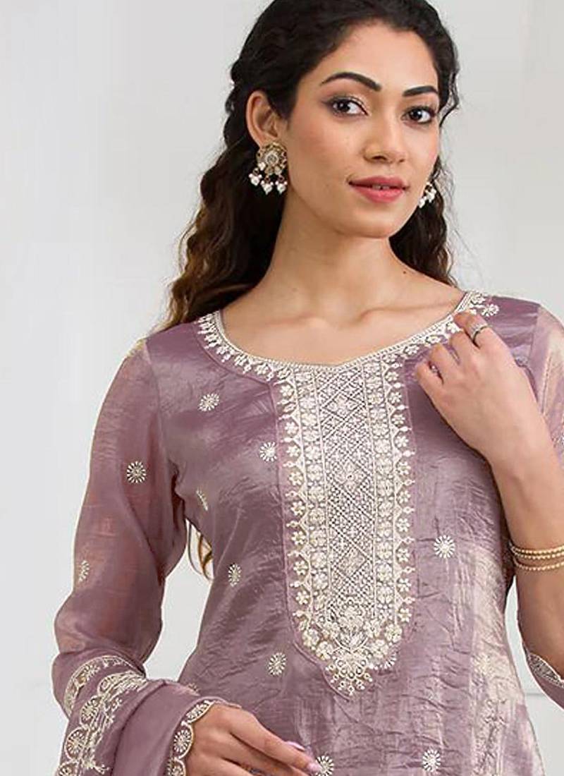 Pink embroidered silk salwar-kameez unstitched