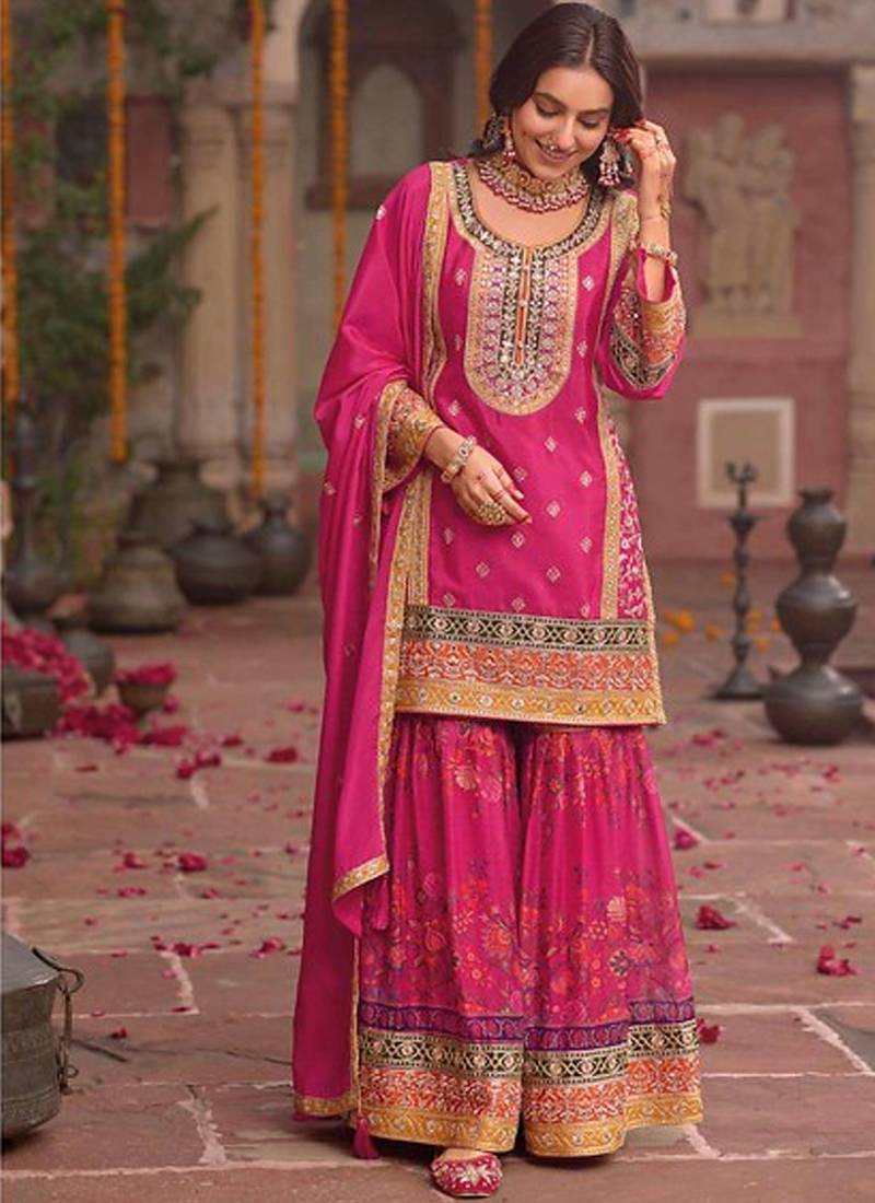 Stylish pink floral printed heavy wedding wear gharara suit for women semi stitched