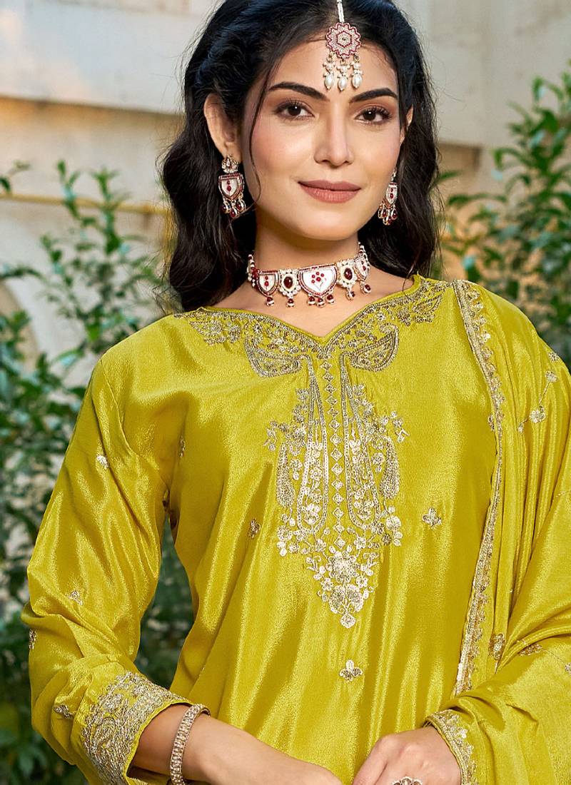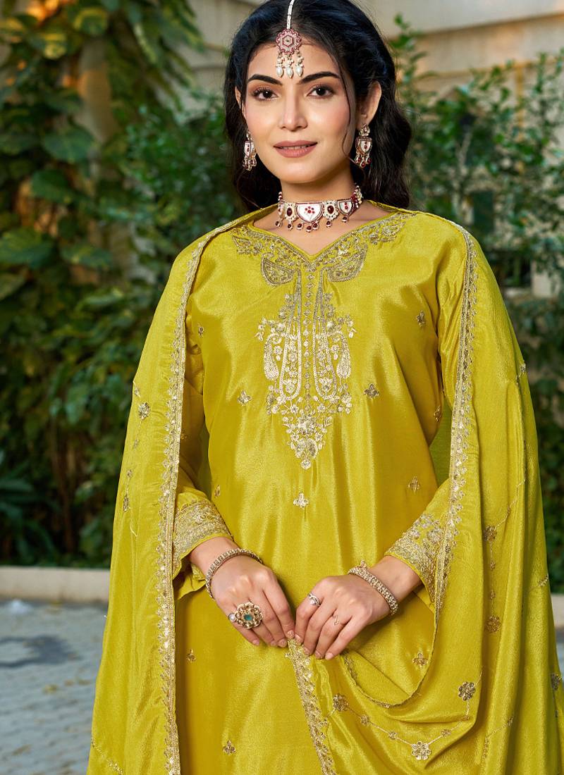 Yellow eid wear chinon palazzo suit for women semi stitched