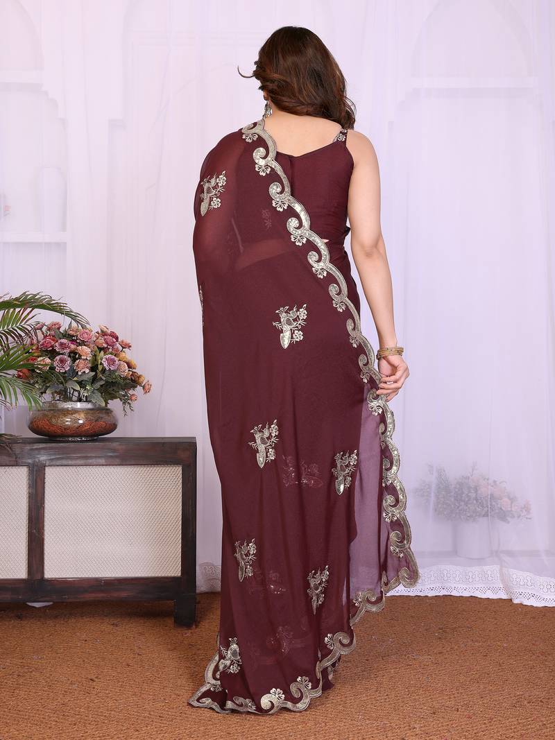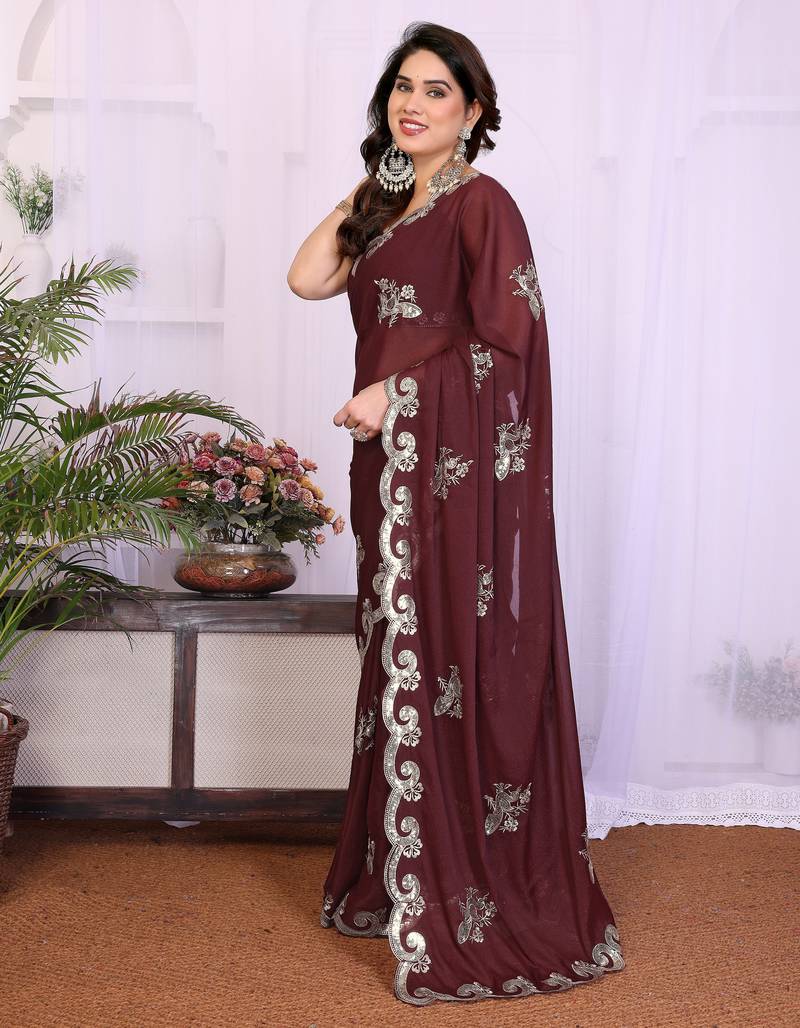 Burgundy saree look rich heavy star georgette silk saree with sequins embroidery work saree and blouse