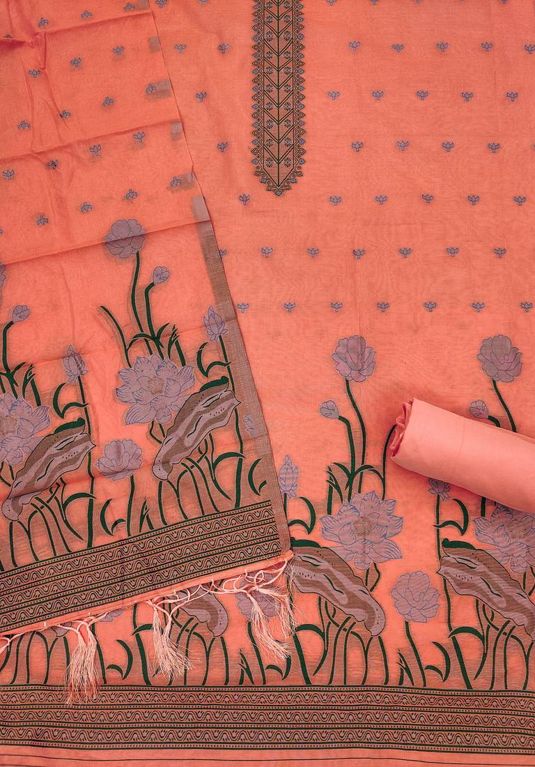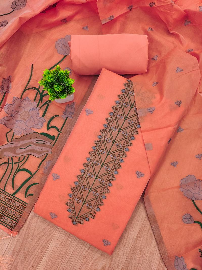 Peach zari woven banarasi dress materials unstitched