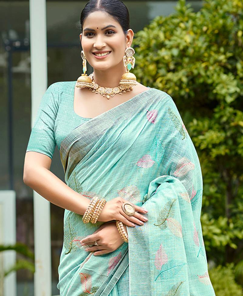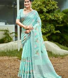 Aqua blue color beautiful rich looks designer linen fabric ceremonial saree