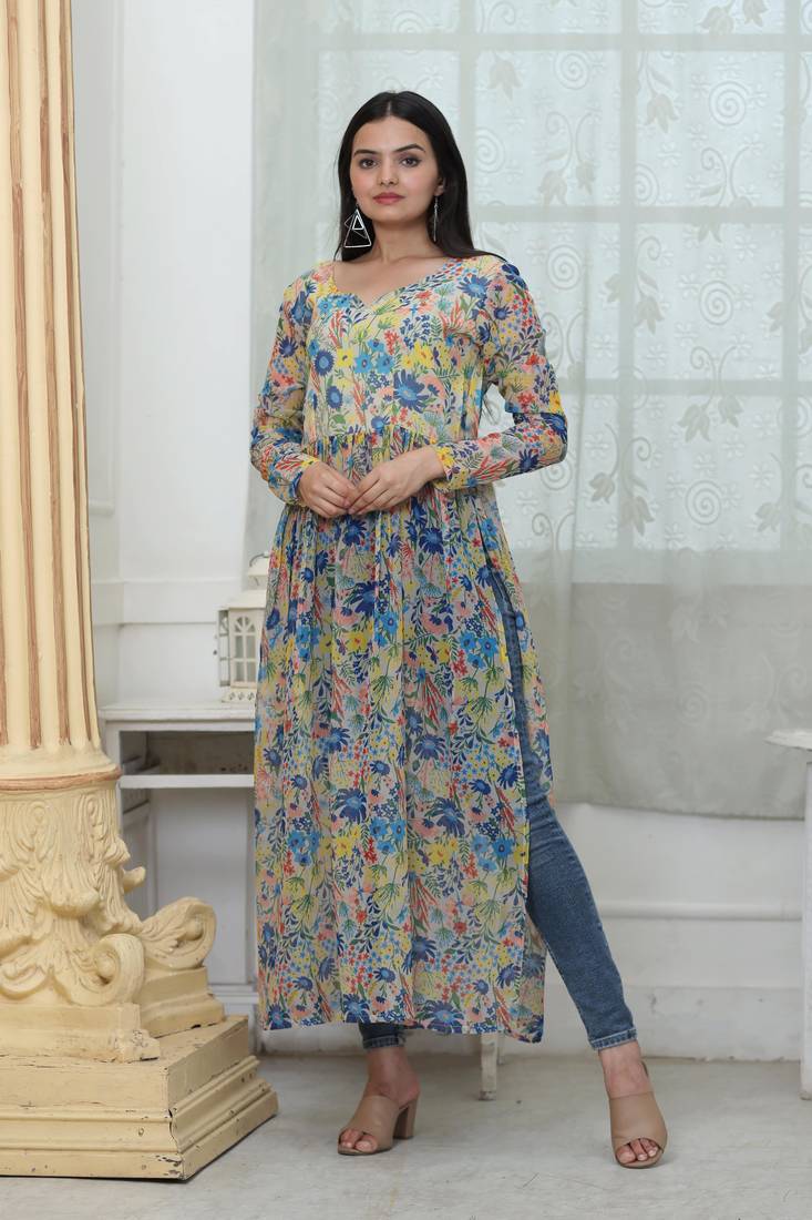 | Product Description | Attrective Looking These Beautiful Looking Readymade With Nyra Cut Kurti.These Kurti Is Fabricated On Faux Georgette.Its Beautified With Designer Floral Digital Printed. |