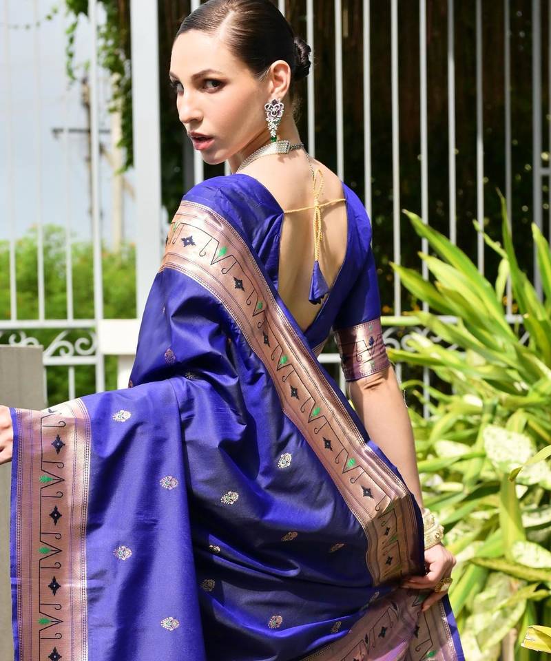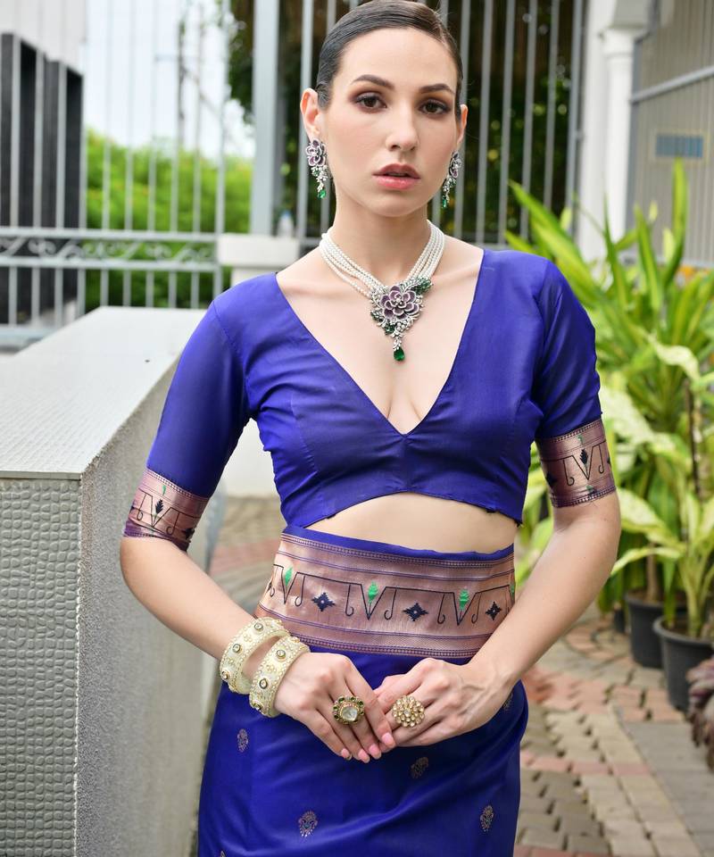 Blue color banarasi silk blend fabric designer partywear saree
