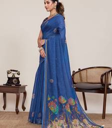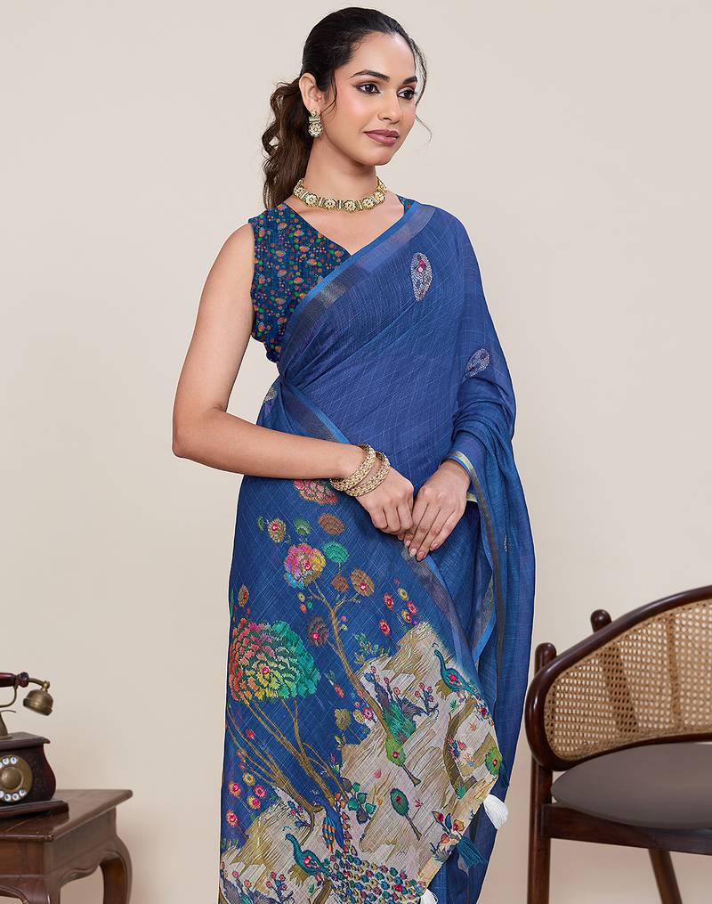 Blue color linen silk fabric ethnic partywear saree