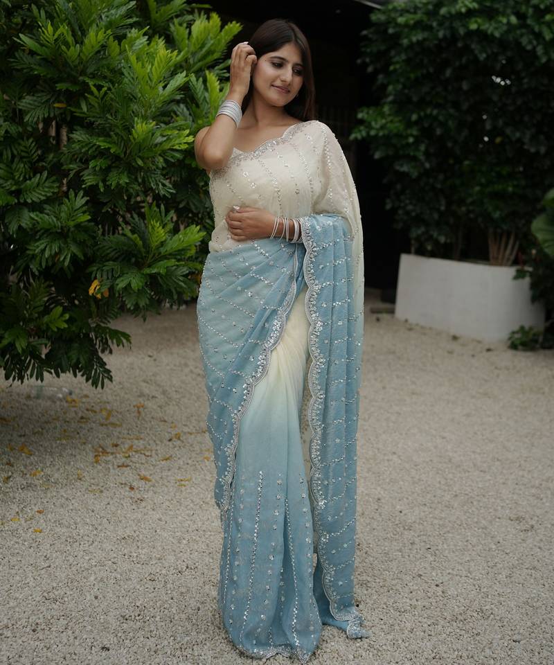| Product Name | Blue Color Trendy Fendy Satin Fabric Pedding With Beads Hand Work Saree | |
