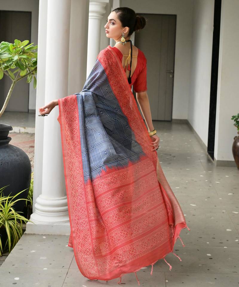 Blue color tussar art silk fabric ikkat printed traditional ethnic saree