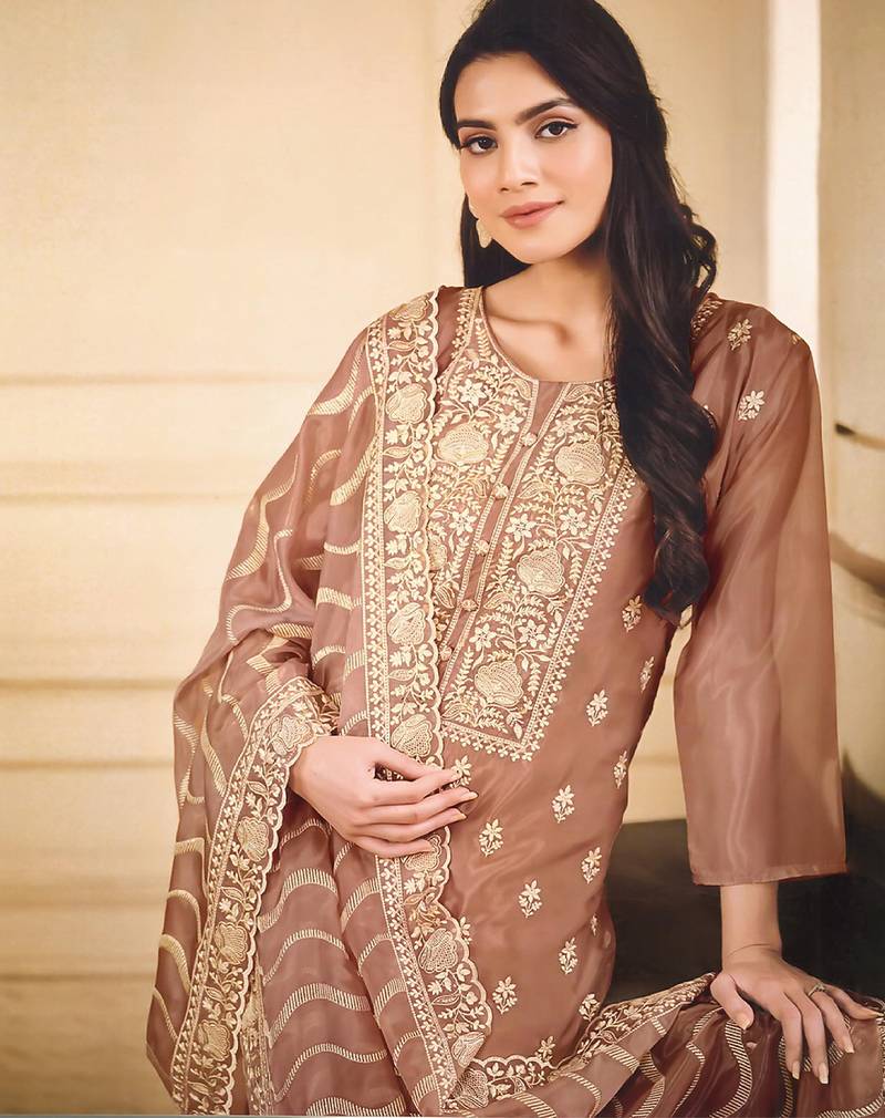 Brown color elegant organza fabric designer embroidered suit semi stitched