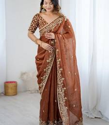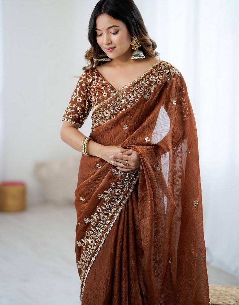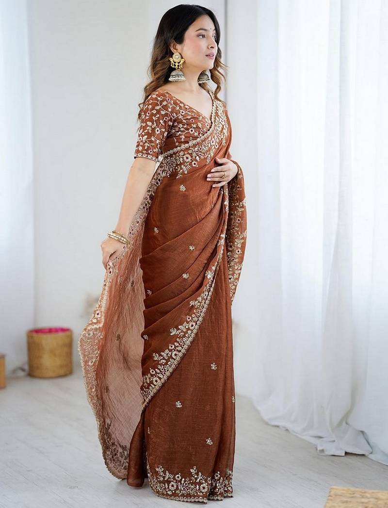 Coffee color fendy chiffon fabric designer embroidered saree for ceremonial looks