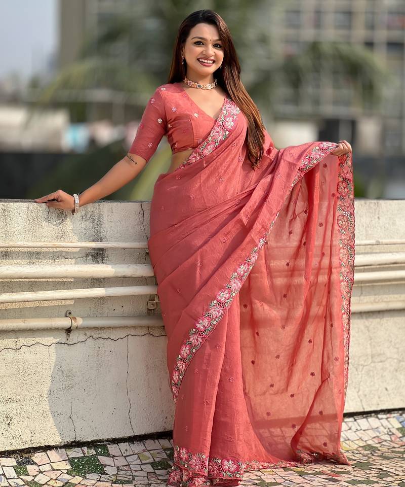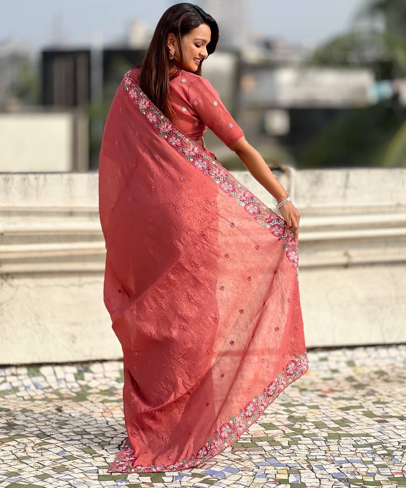 Coral color crush silk blend fabric designer embroidered wedding special saree