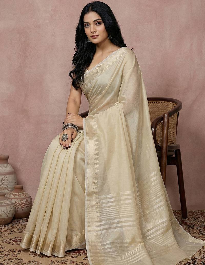 Cream color blended cotton woven designer ceremonial sober looks saree