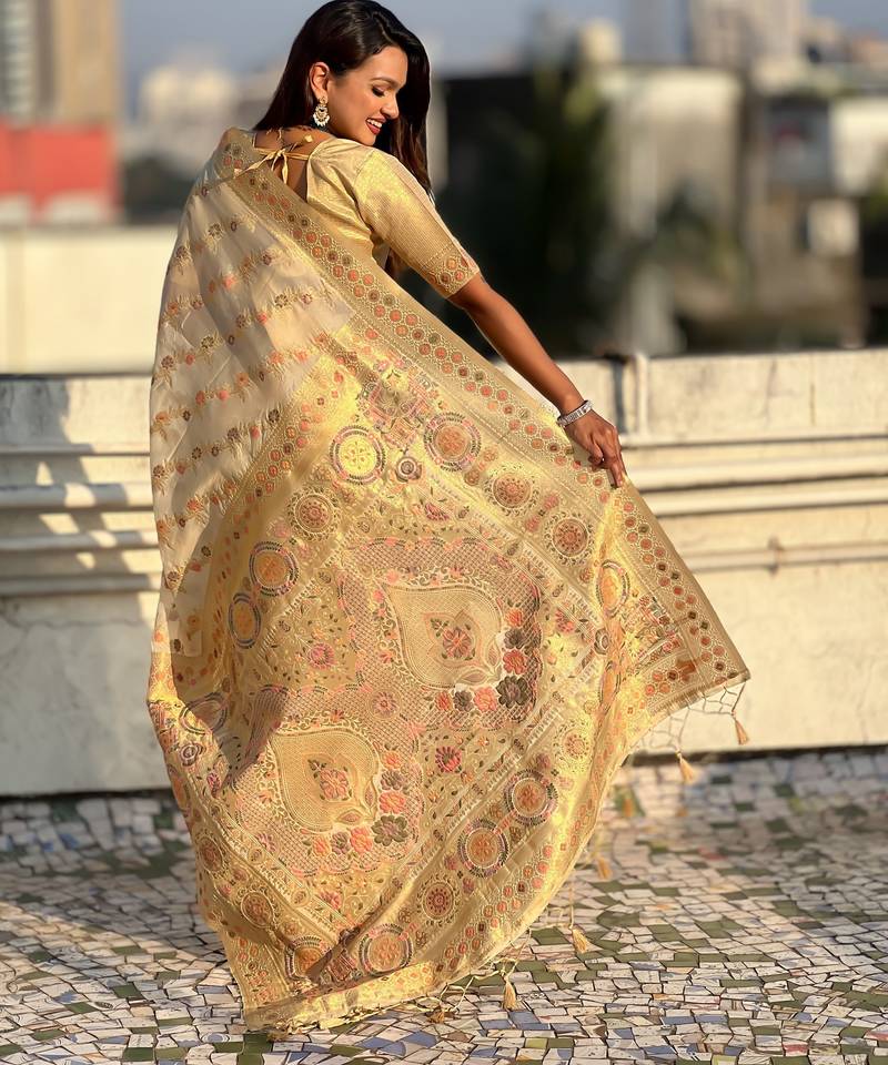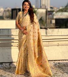 Cream color kora silk fabric woven leheria designer saree