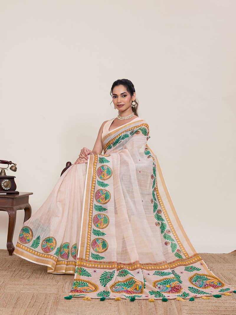 | Product Name | Cream Color Linen Silk Fabric Ethnic Partywear Saree | |