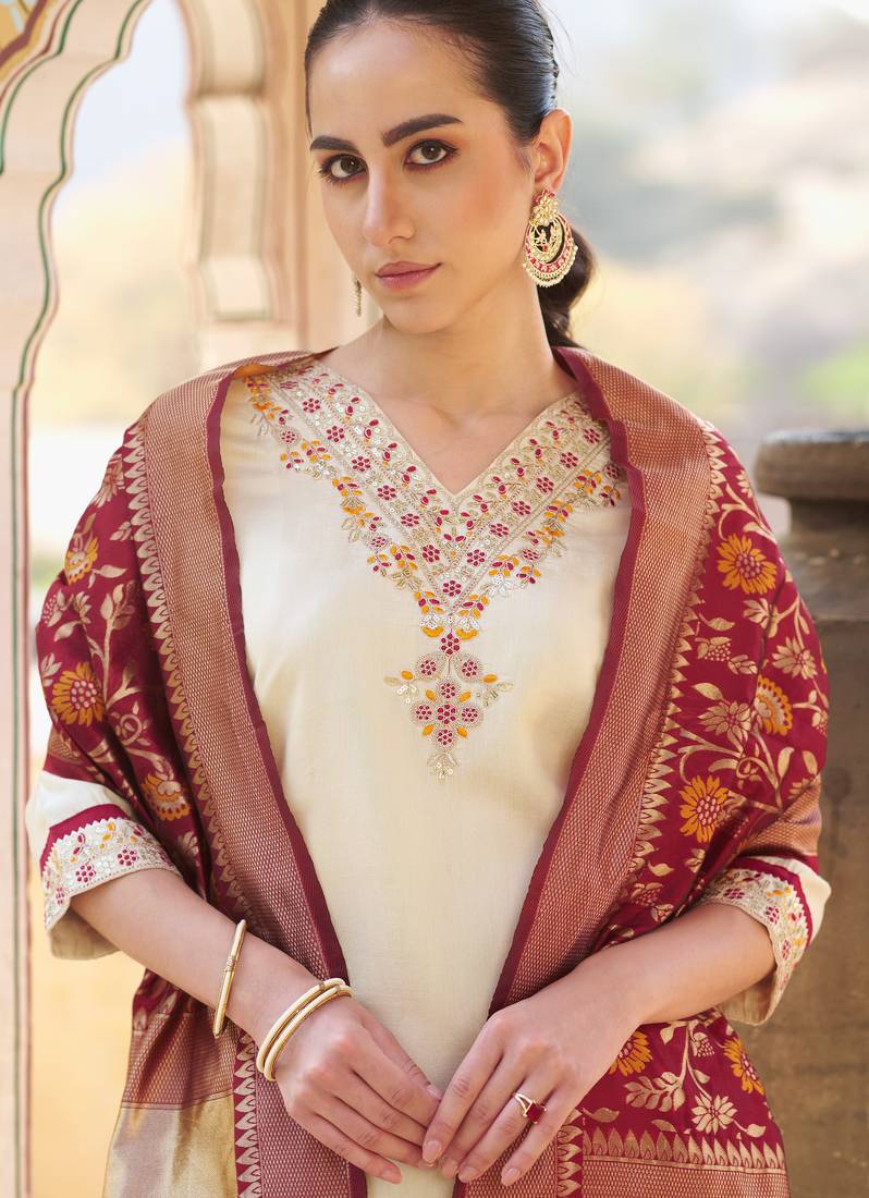 Cream color silk blend fabric beautiful embroidered kurta set with dupatta