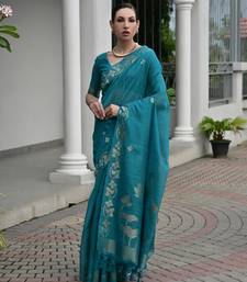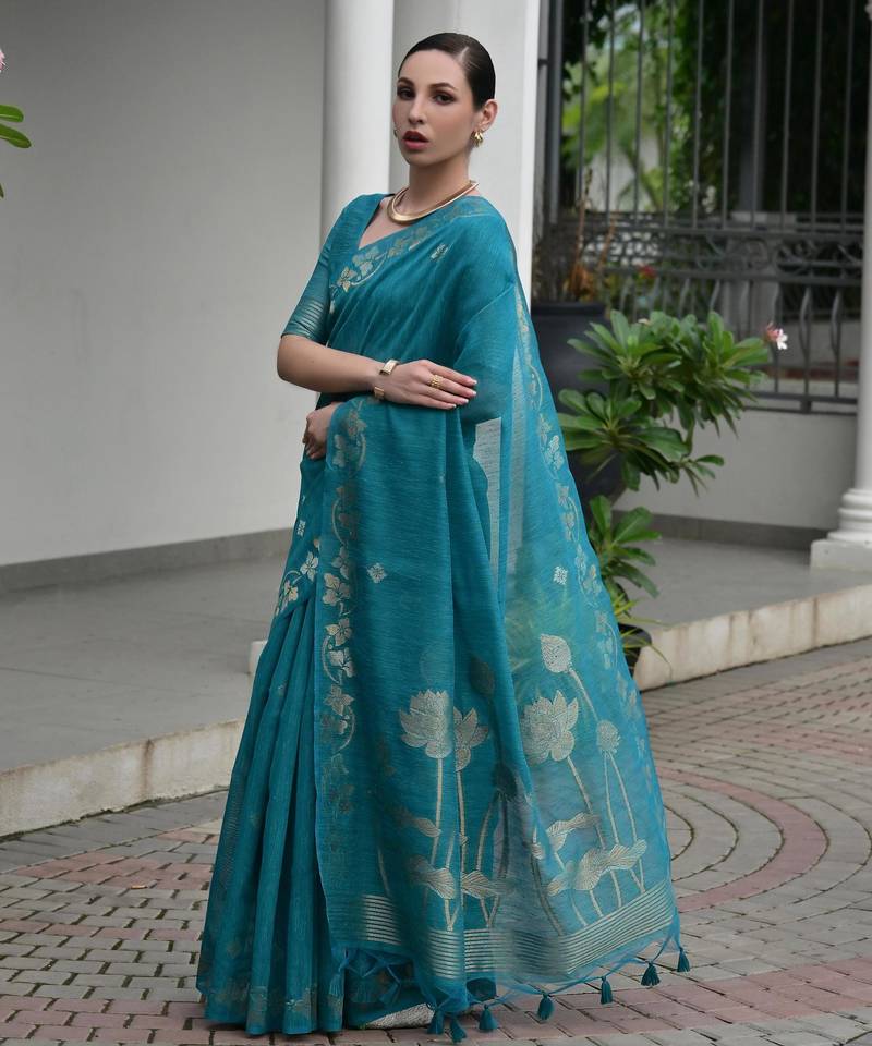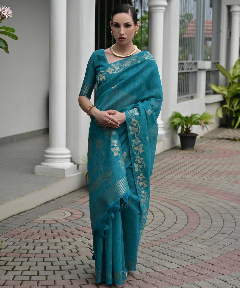Firozi color jute linen silk fabric beautiful graceful saree