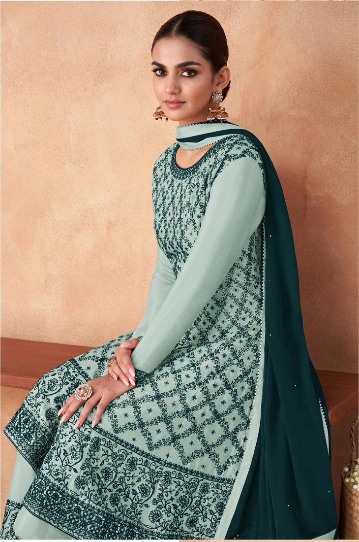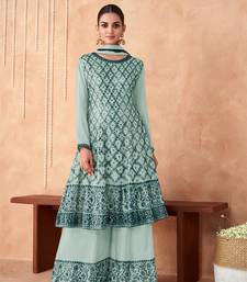Green colour designer resham embroidery palazzo dress for festive season semi stitched