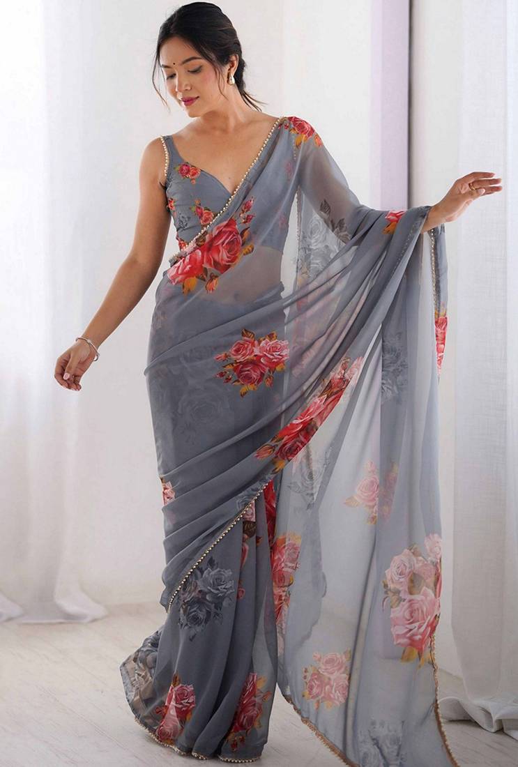 | Product Name | Grey Color Beautiful Floral Printed Ceremonial Georgette Saree | |
