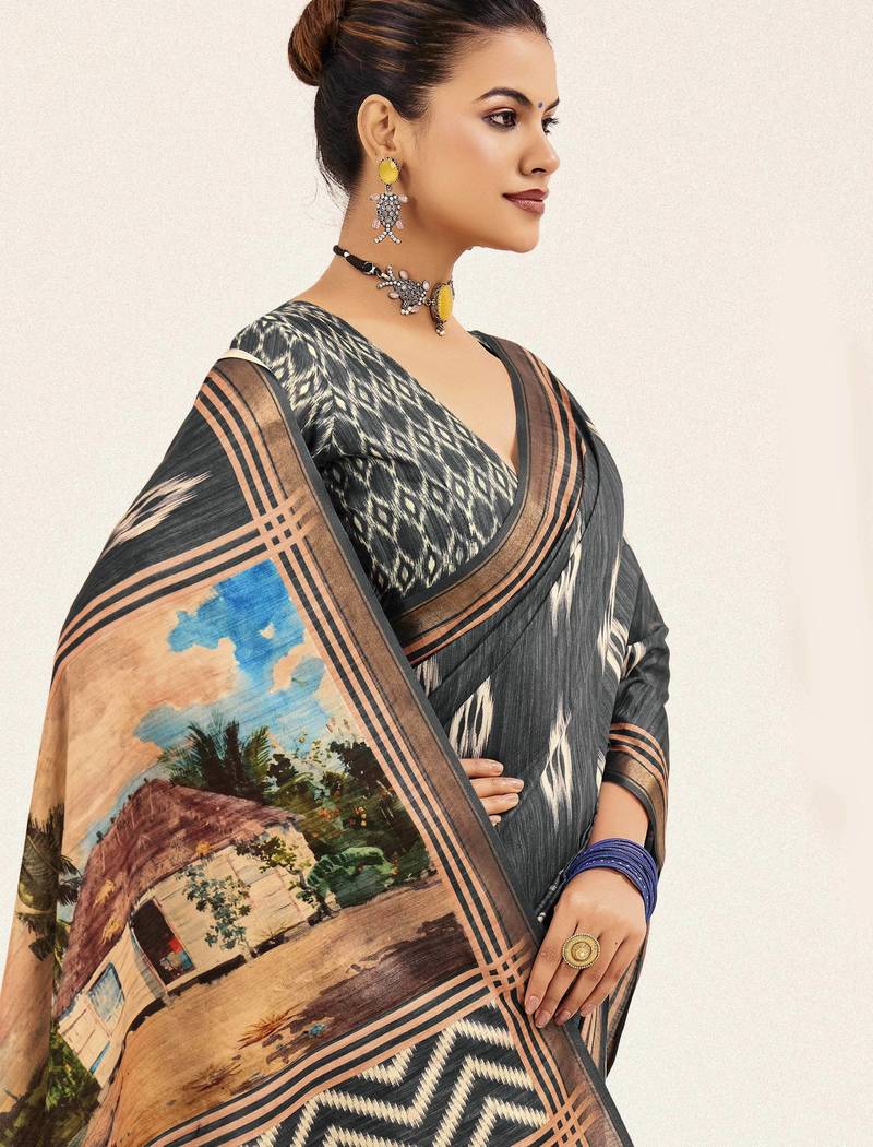 Grey color cotton art silk fabric designer digital printed saree