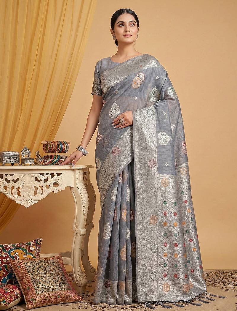 | Product Name | Grey Color Linen Cotton Fabric Woven Designer Partywear Saree | |