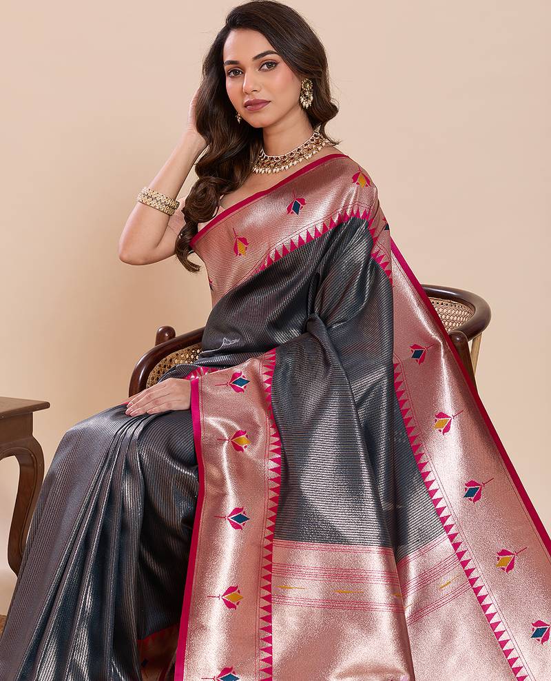 Grey color soft silk blend fabric woven jari designer partywear saree