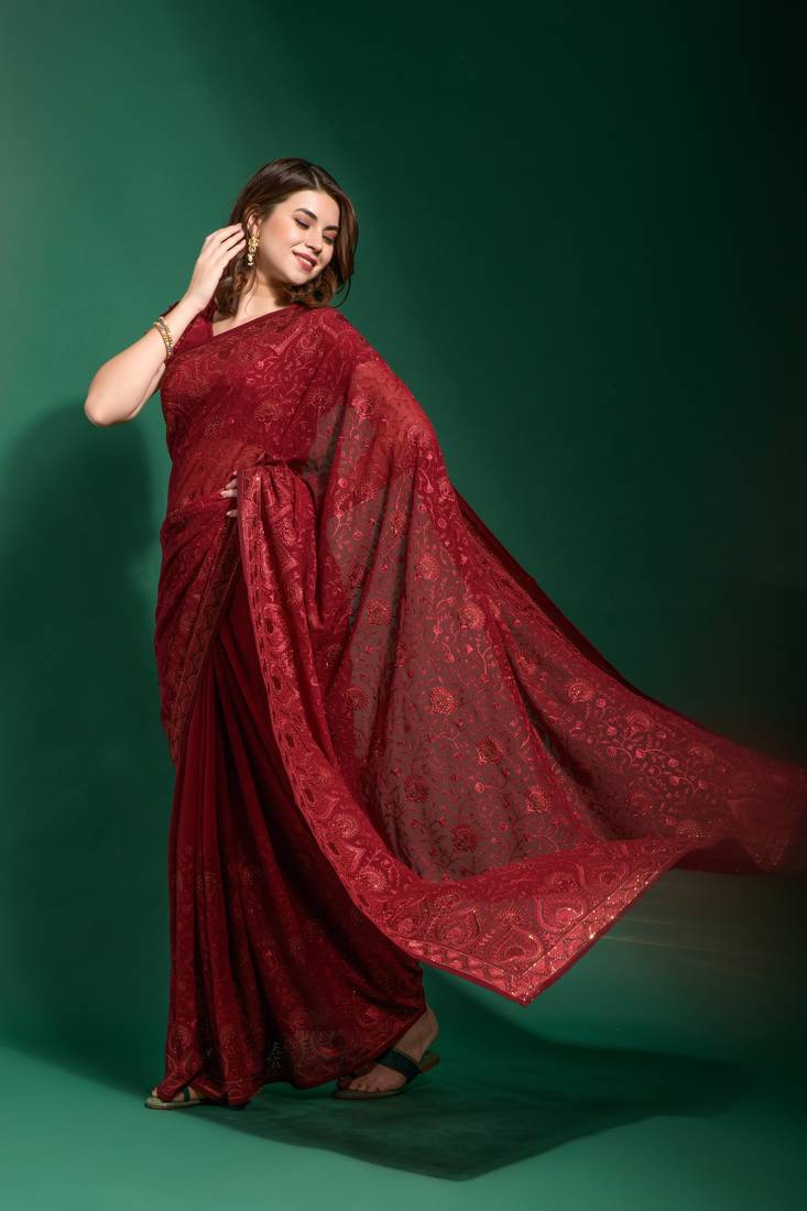 Heavy and glamorous maroon colour party wear thread and diamond work saree