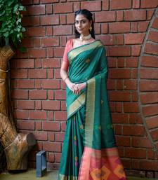 Heavy traditional katha wevon ikkat pallu designer rama colour raw silk saree