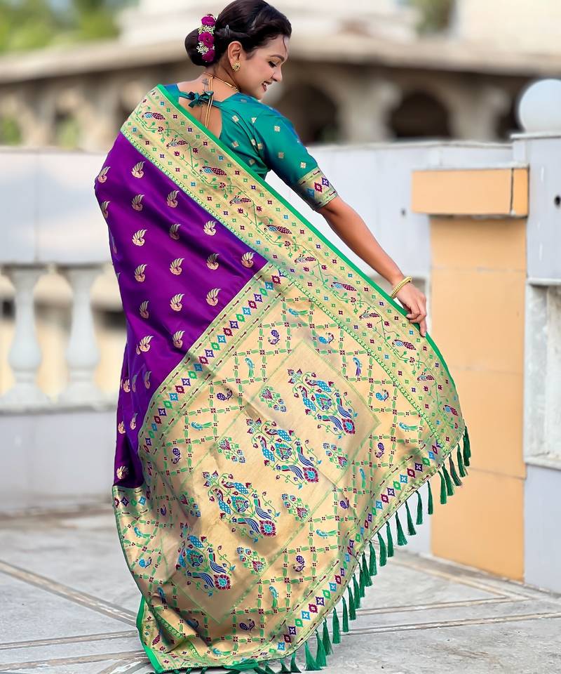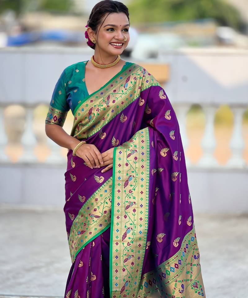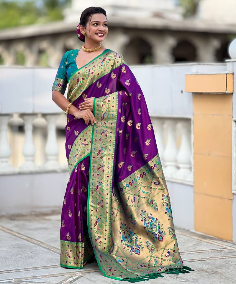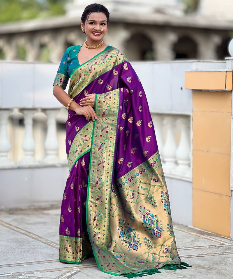 Magenta color paithani silk blend woven meenakari jacquard designer saree
