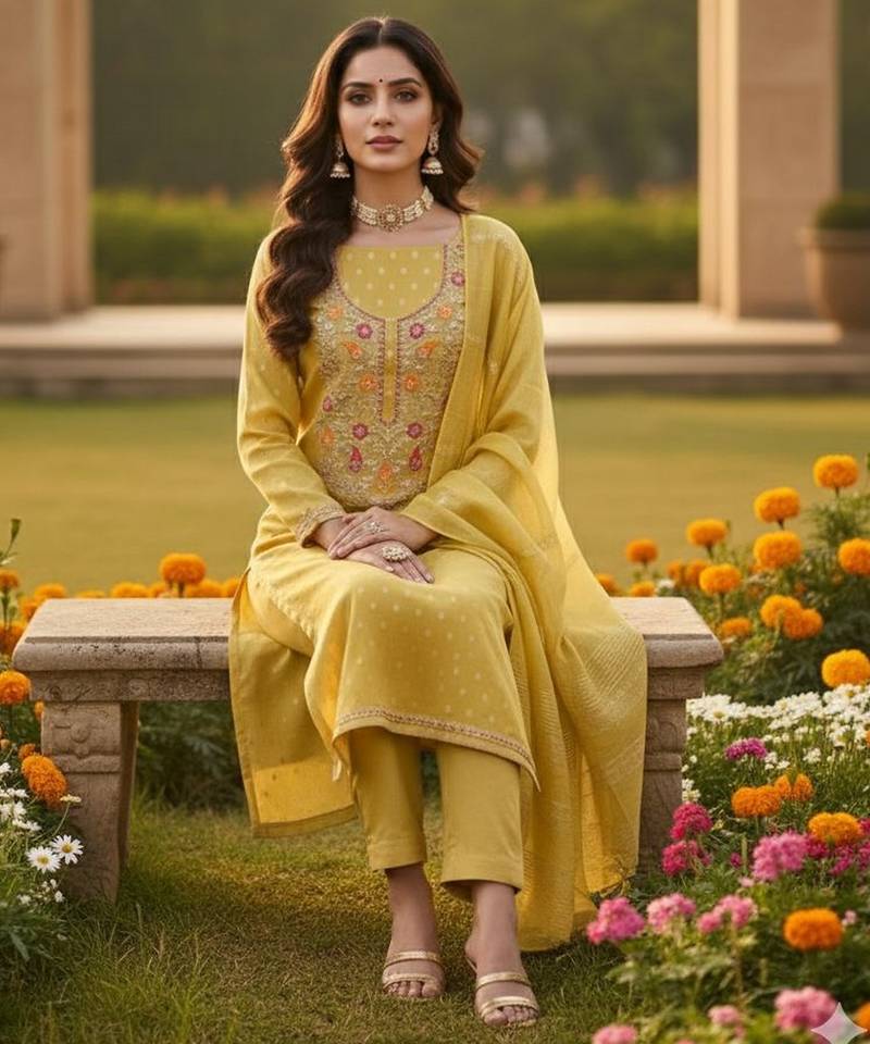 | Product Name | Mustard Shimmer Jacquard Ethnic Readymade Suit | |