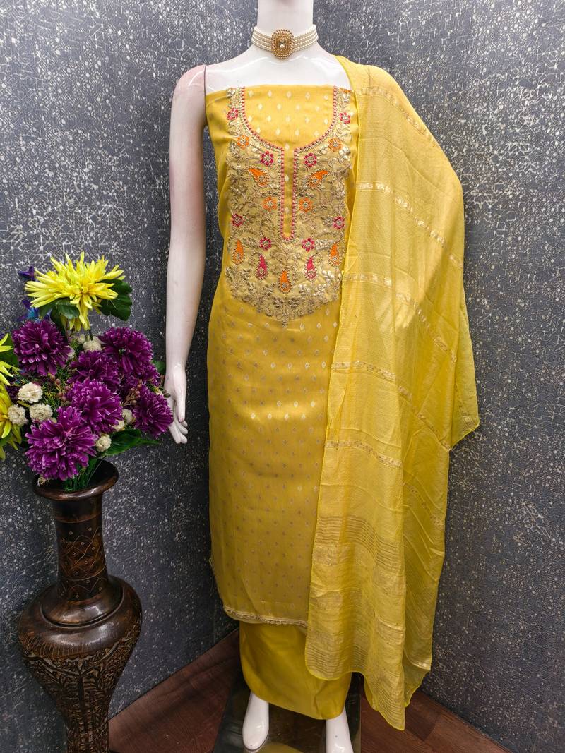 Mustard shimmer jacquard ethnic readymade suit unstitched