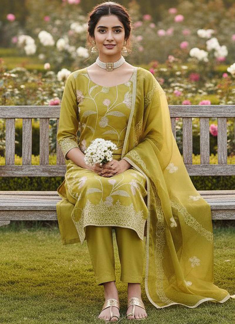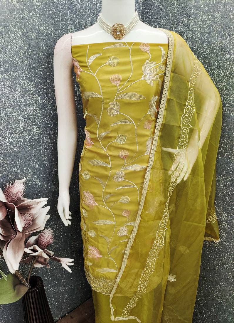 Mustard color glass cotton fabric embroidered ethnic salwar suit unstitched